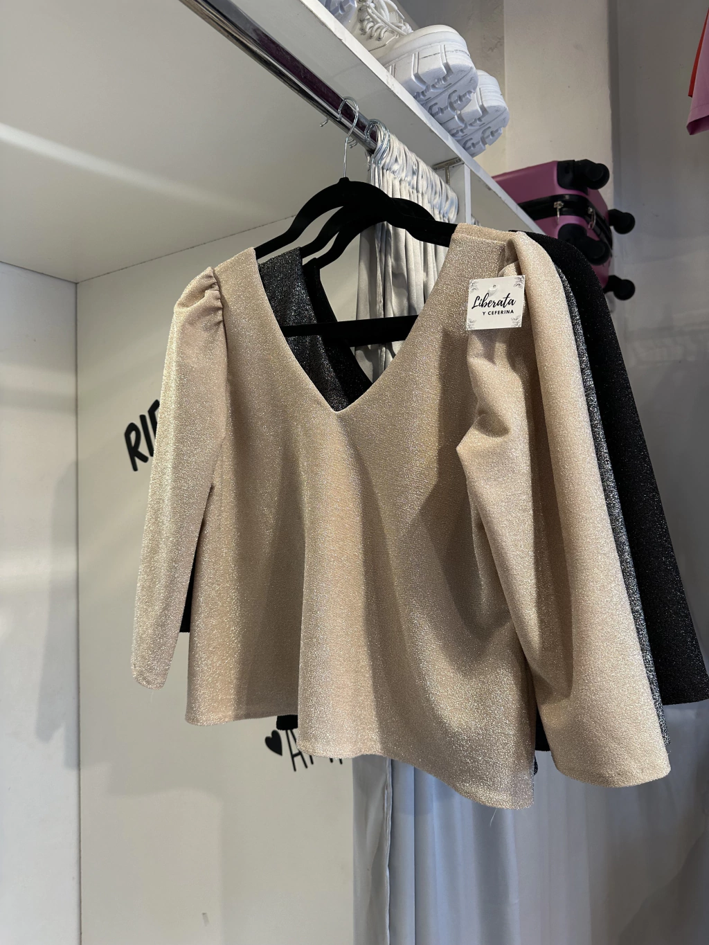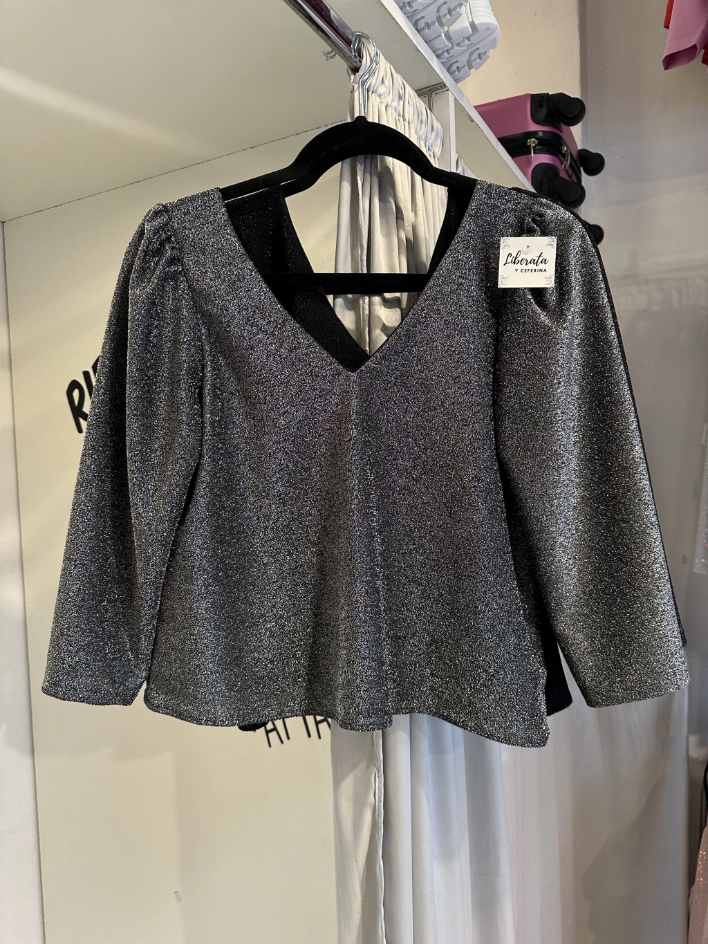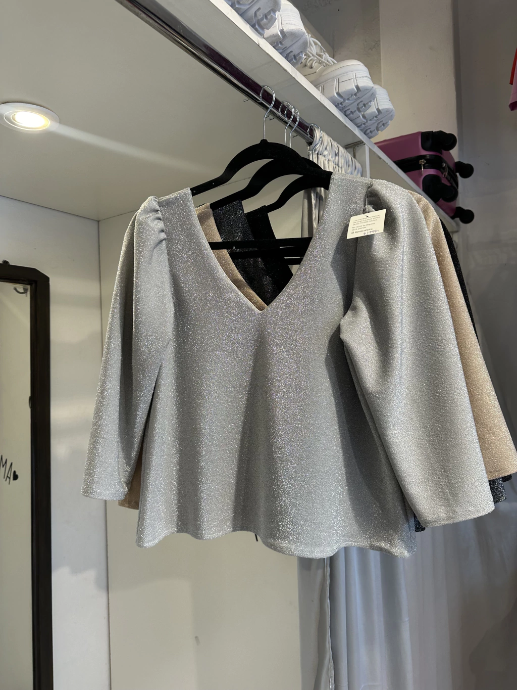 Blusa de lurex con manga 3/4. Escote en V en ambos lados. Forreria al tono. Manga princesa.
