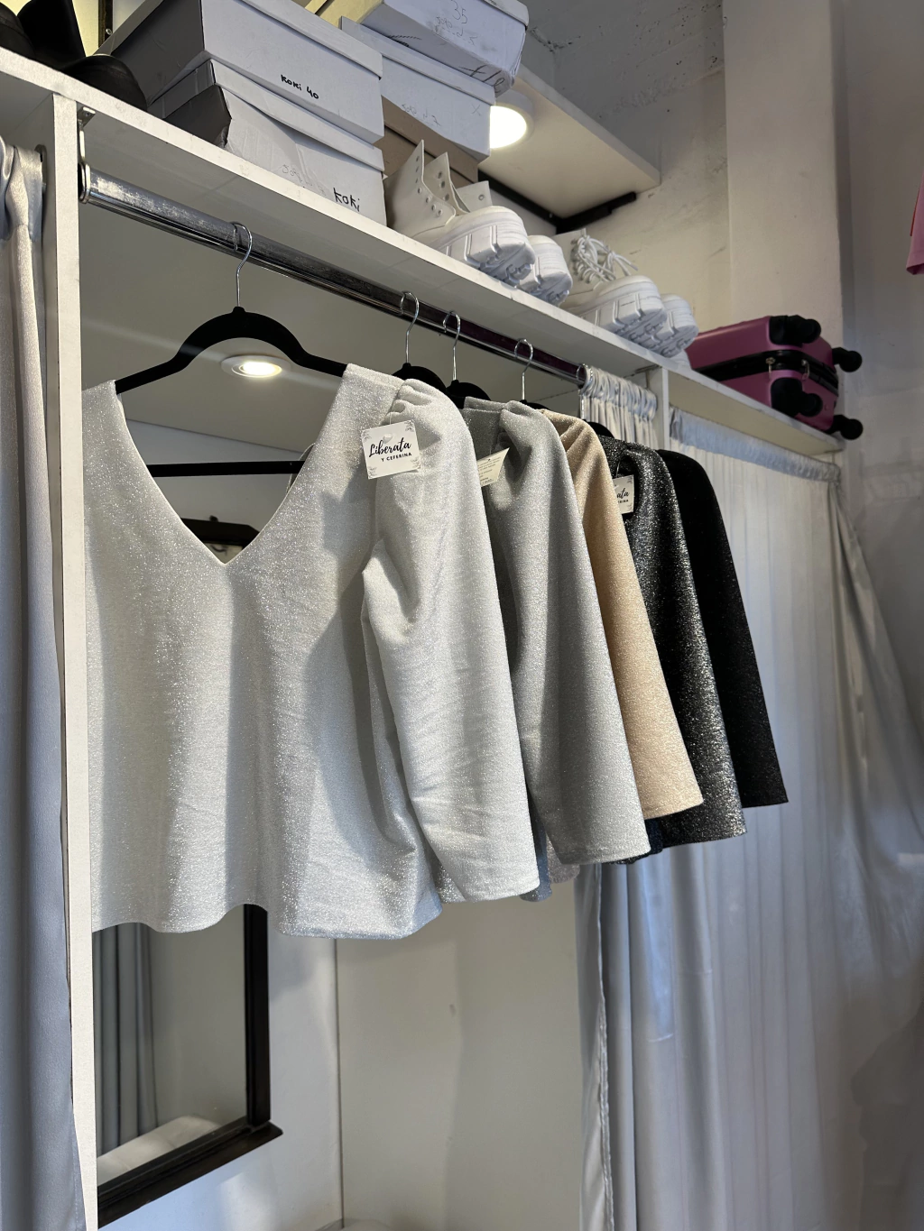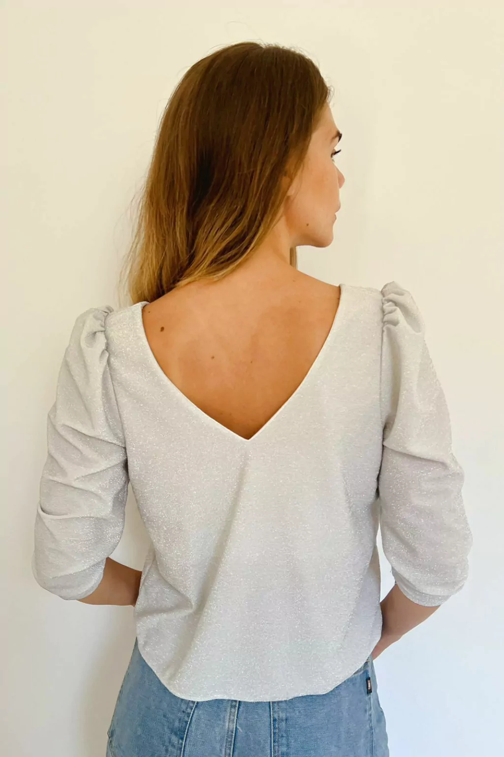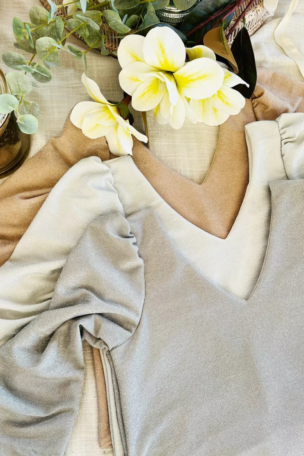 Blusa de lurex con manga 3/4. Escote en V en ambos lados. Forreria al tono. Manga princesa.
