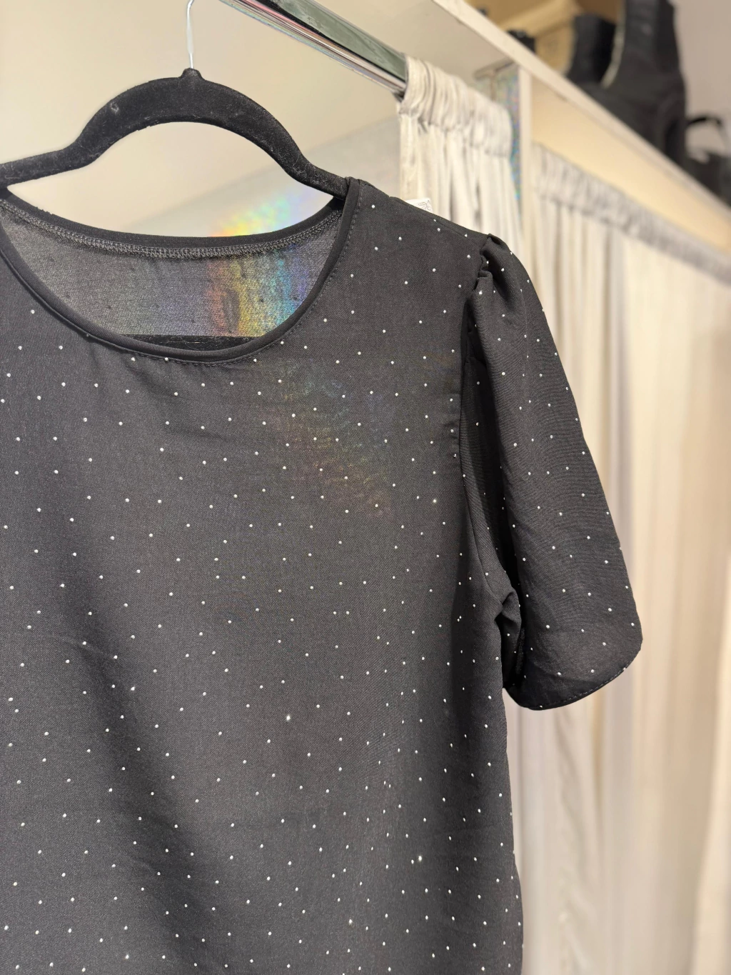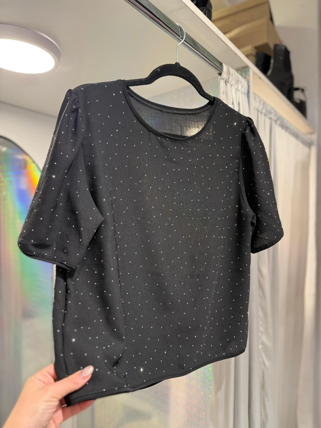 Blusa Strass de Crepé – Elegante y con un toque de brillo, confeccionada en crepé de calidad con detalles de strass que realzan su estilo. Presenta escote redondo y mangas cortas, ideal para looks sofisticados de día o de noche. Una prenda versátil que combina comodidad y glamour en cada ocasión.