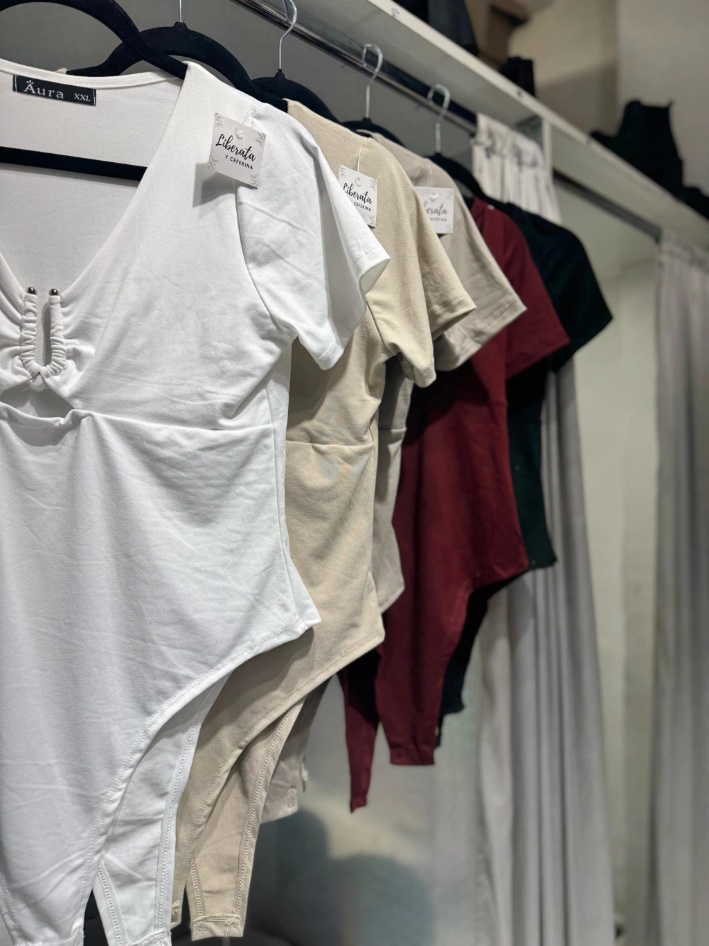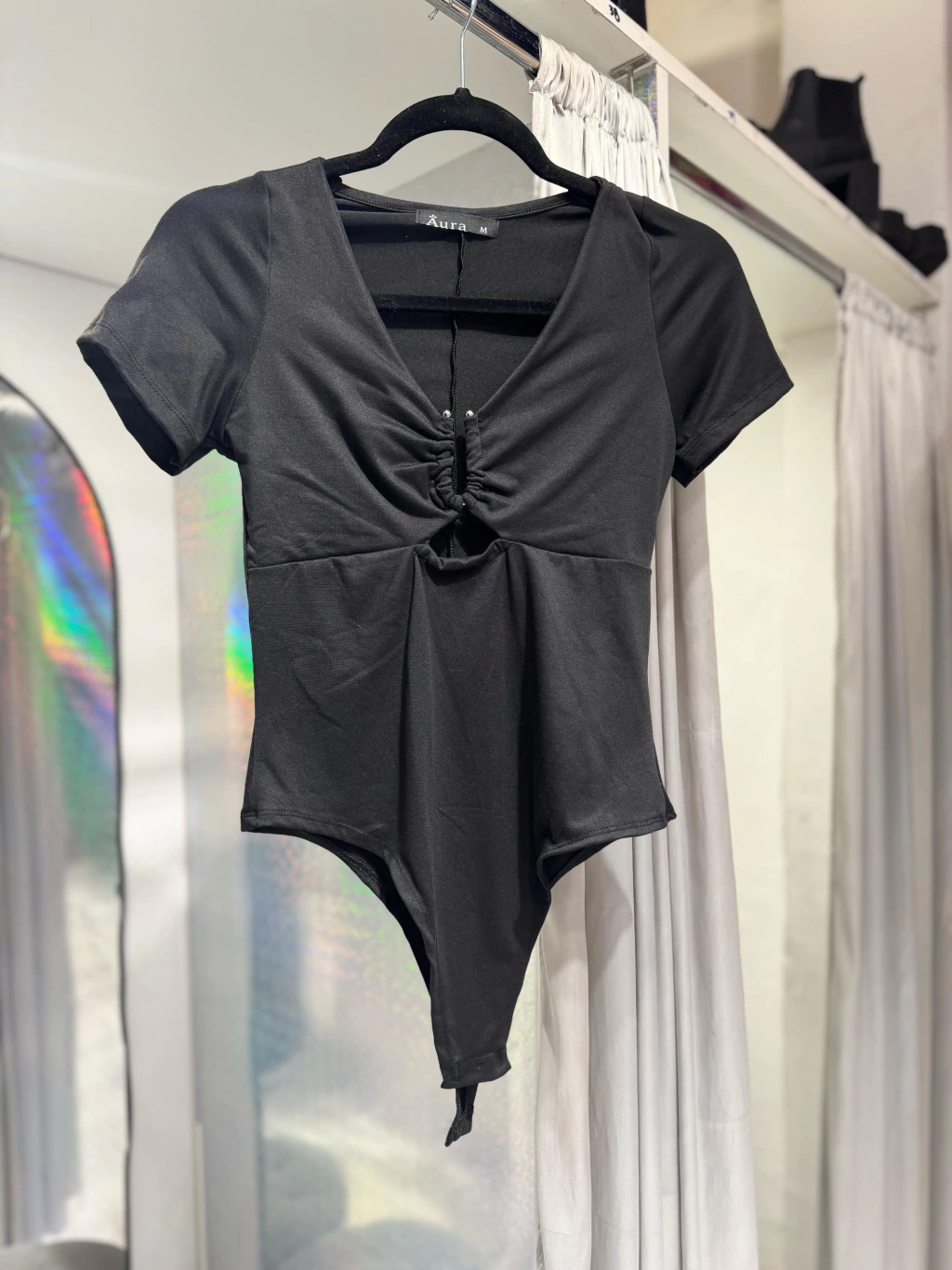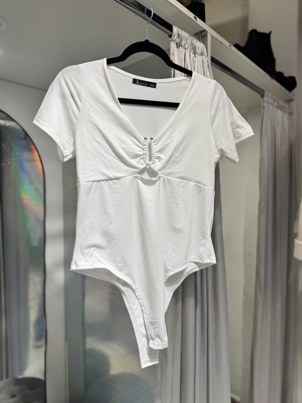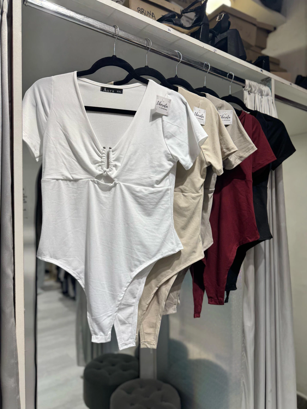 Este body con escote en V y mangas cortas es una prenda sofisticada y moderna que no puede faltar en tu colección. Su diseño único incluye corpiños delanteros unidos entre sí con un herraje tipo herradura, un detalle elegante que aporta un toque de originalidad y estilo. Perfecto para cualquier ocasión, ya sea para un look casual chic o para un evento más formal.