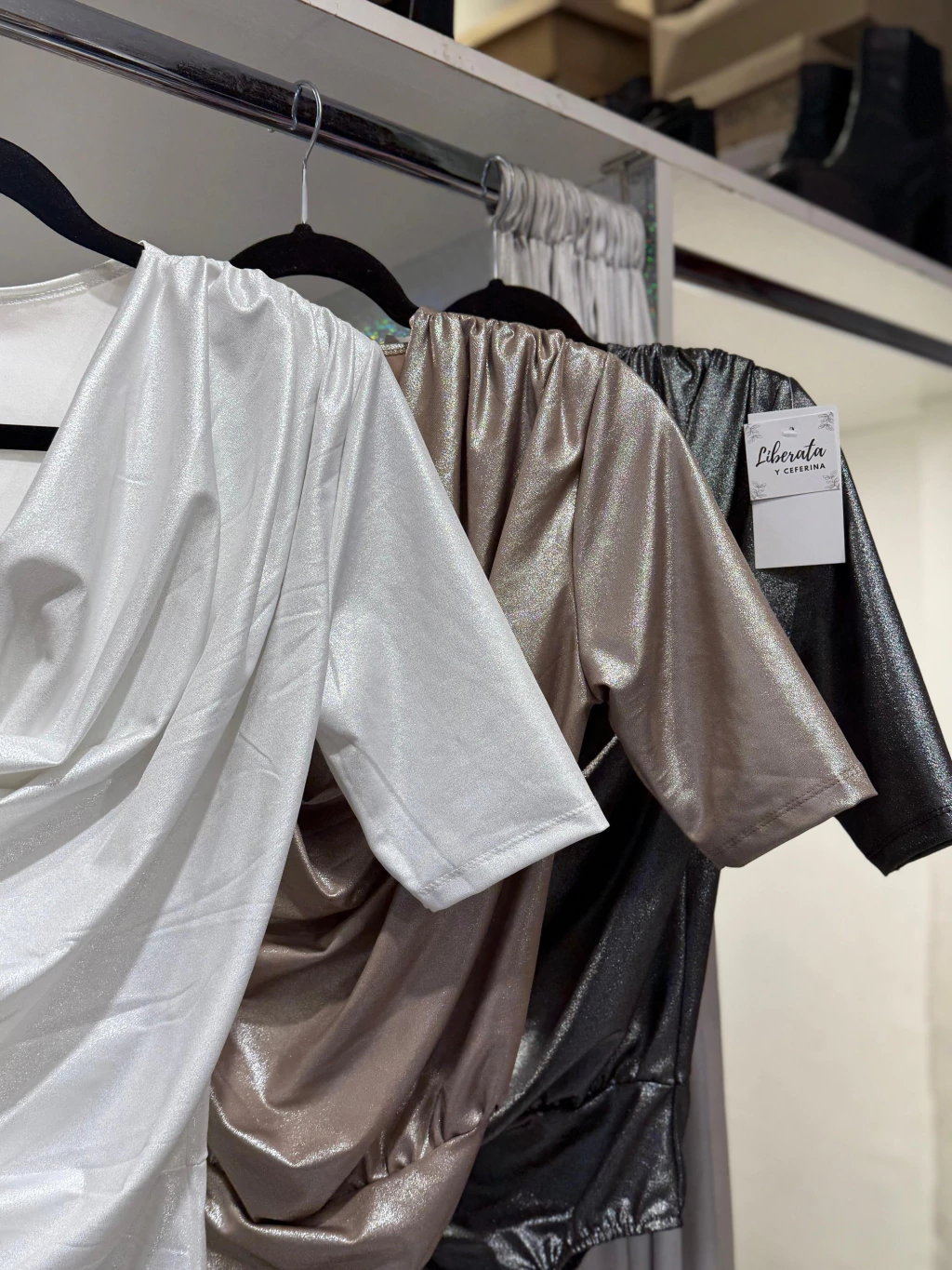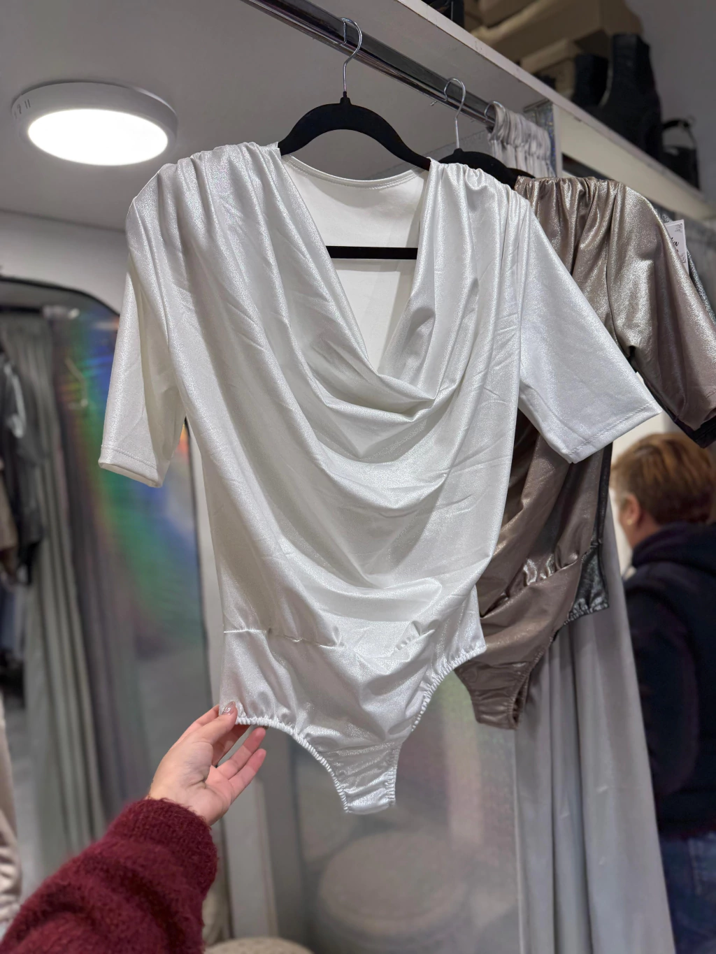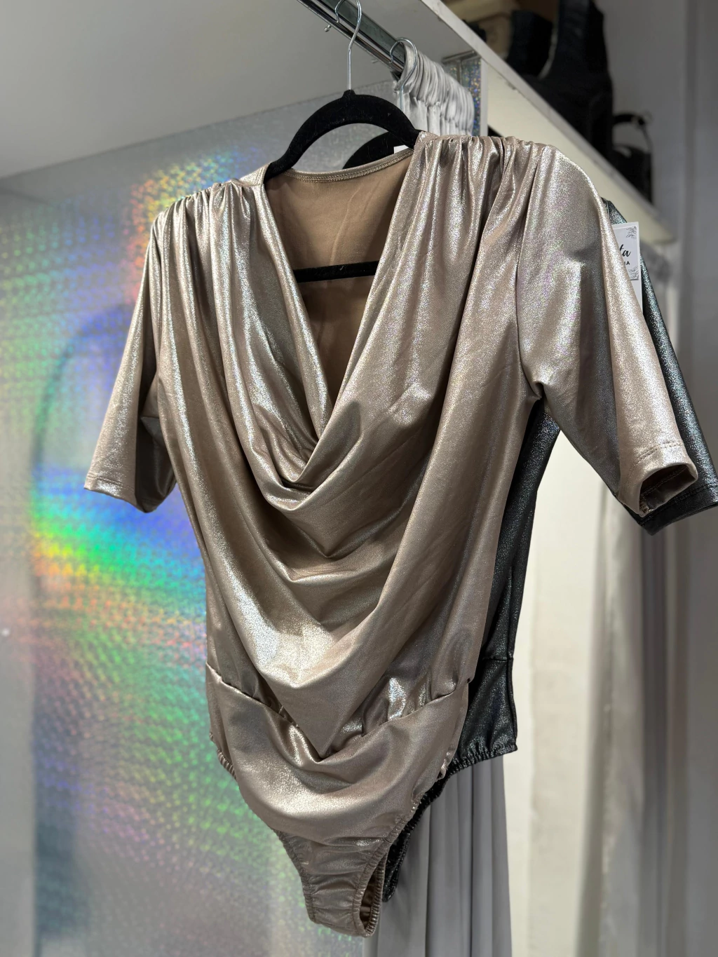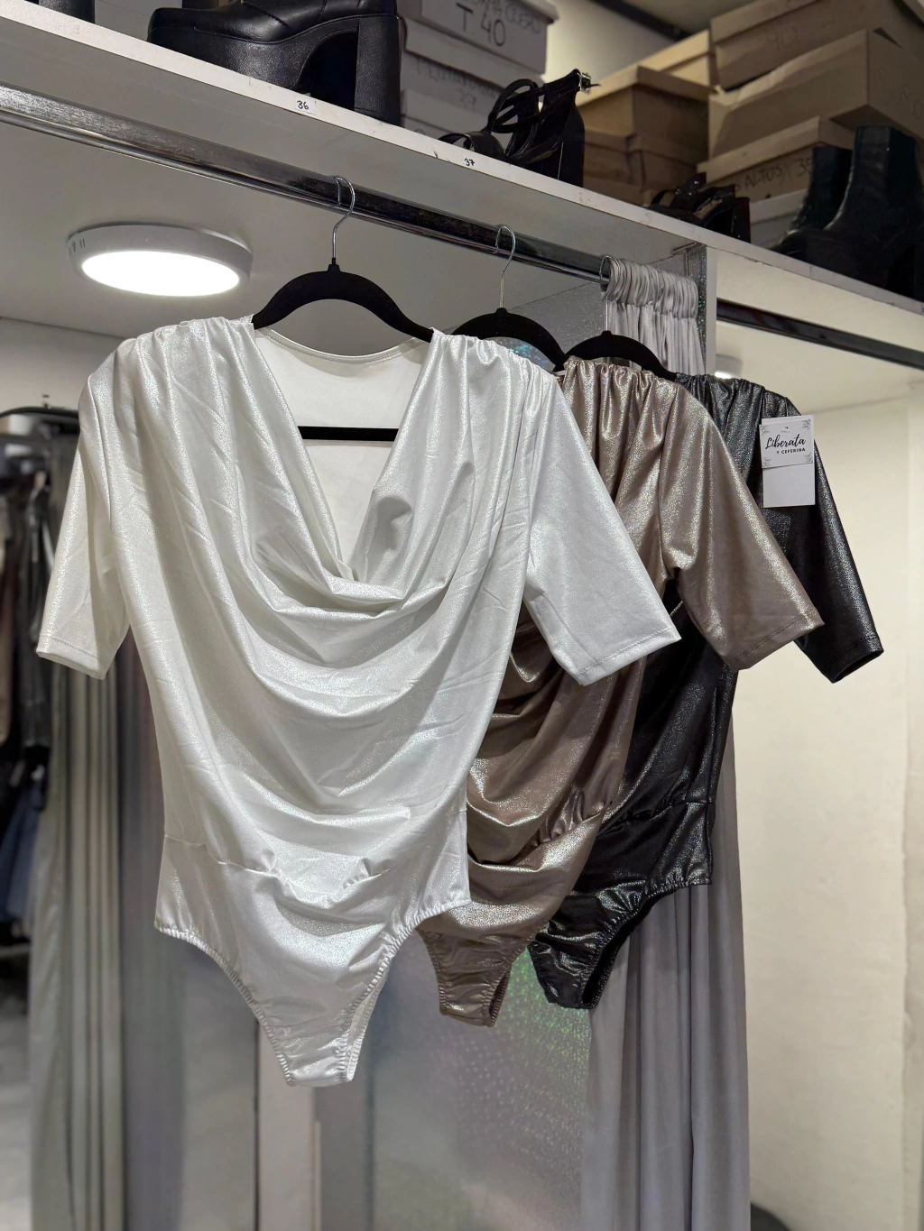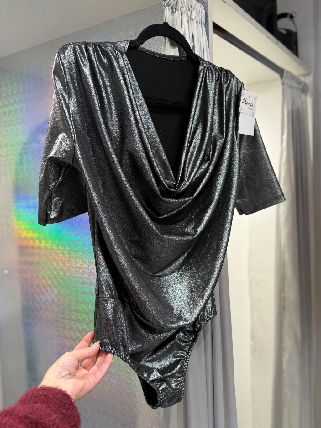 Body de lycra con brillo y escote buche: confeccionado en lycra elastizada con acabado brillante que realza cualquier look. Presenta escote buche delantero, manga corta y calce ajustado que acompaña la silueta. Una prenda versátil y elegante, ideal para salidas nocturnas o eventos especiales.