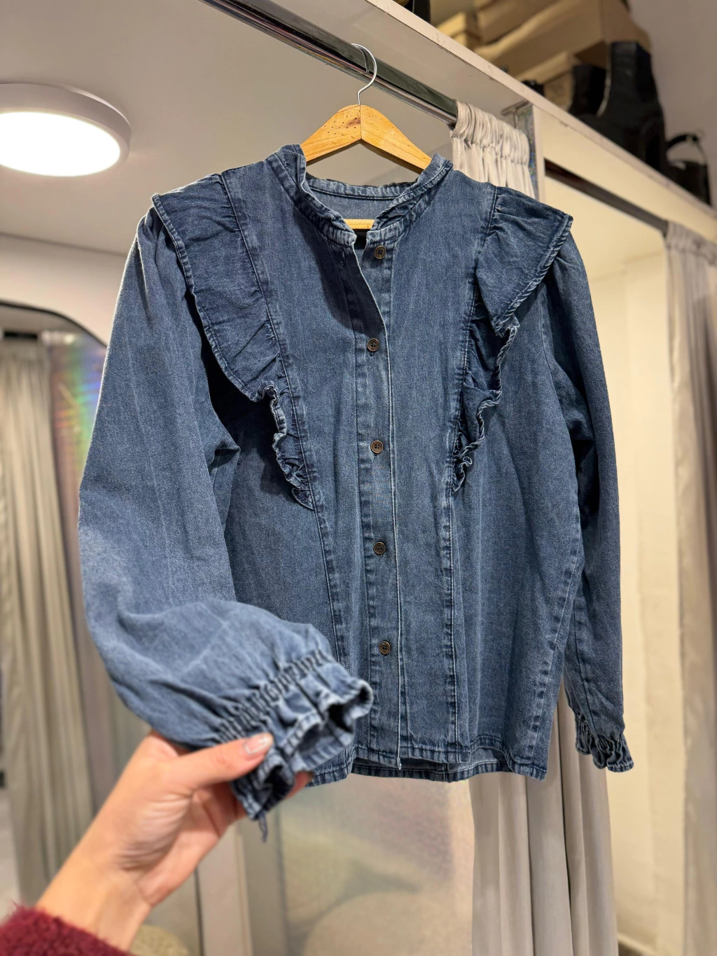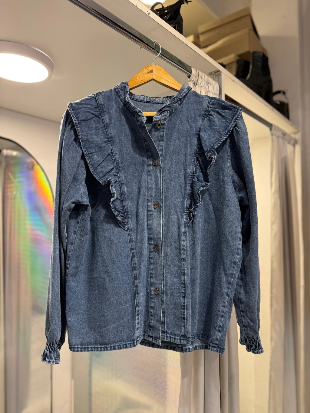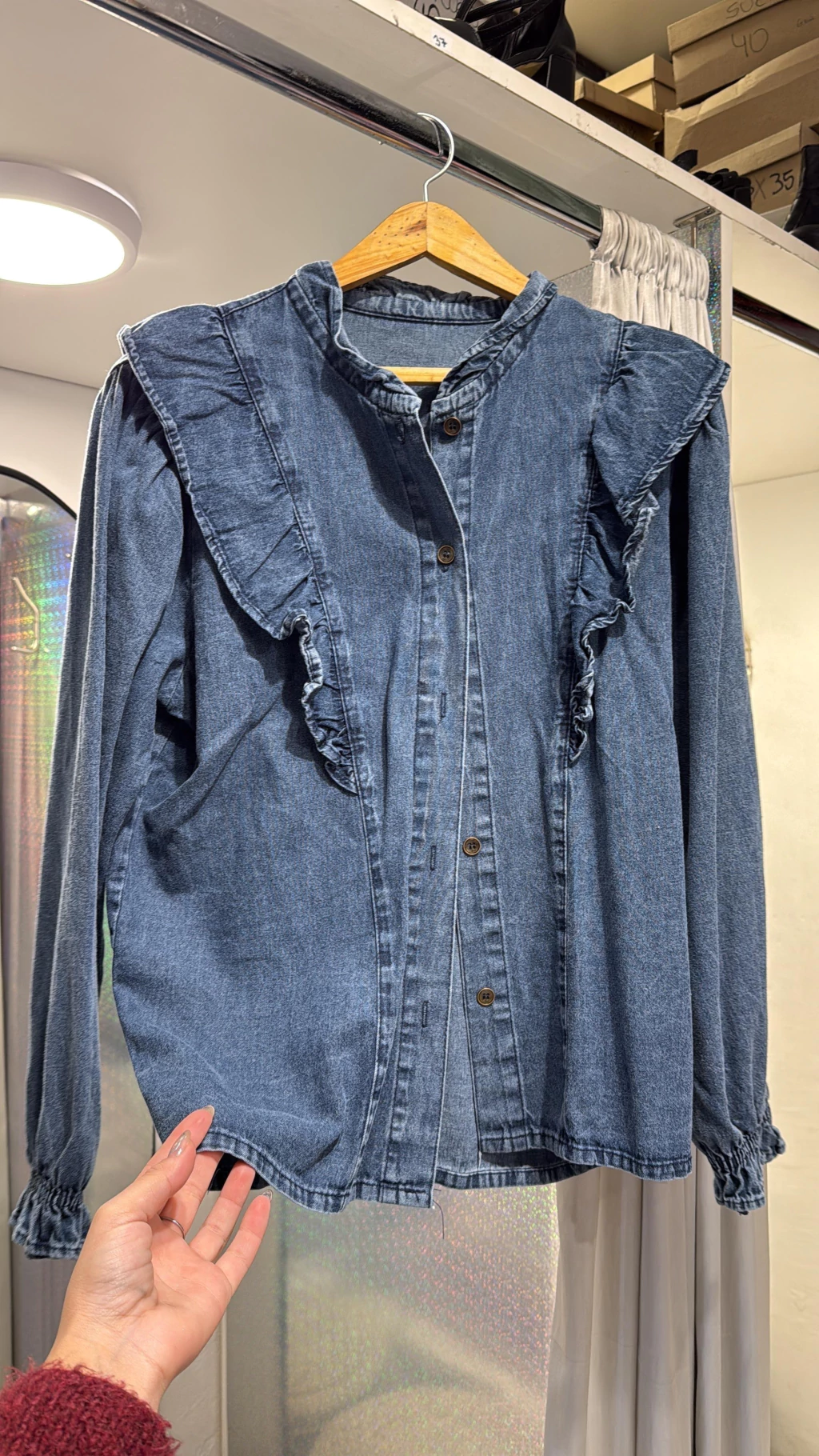 Camisa de Jean con Volados en el Frente – Un básico con un toque femenino y moderno. Confeccionada en jean de calidad, presenta volados en el frente que aportan delicadeza y movimiento al look. Ideal para combinar con jeans, pantalones o faldas, logrando un outfit casual, fresco y con estilo.