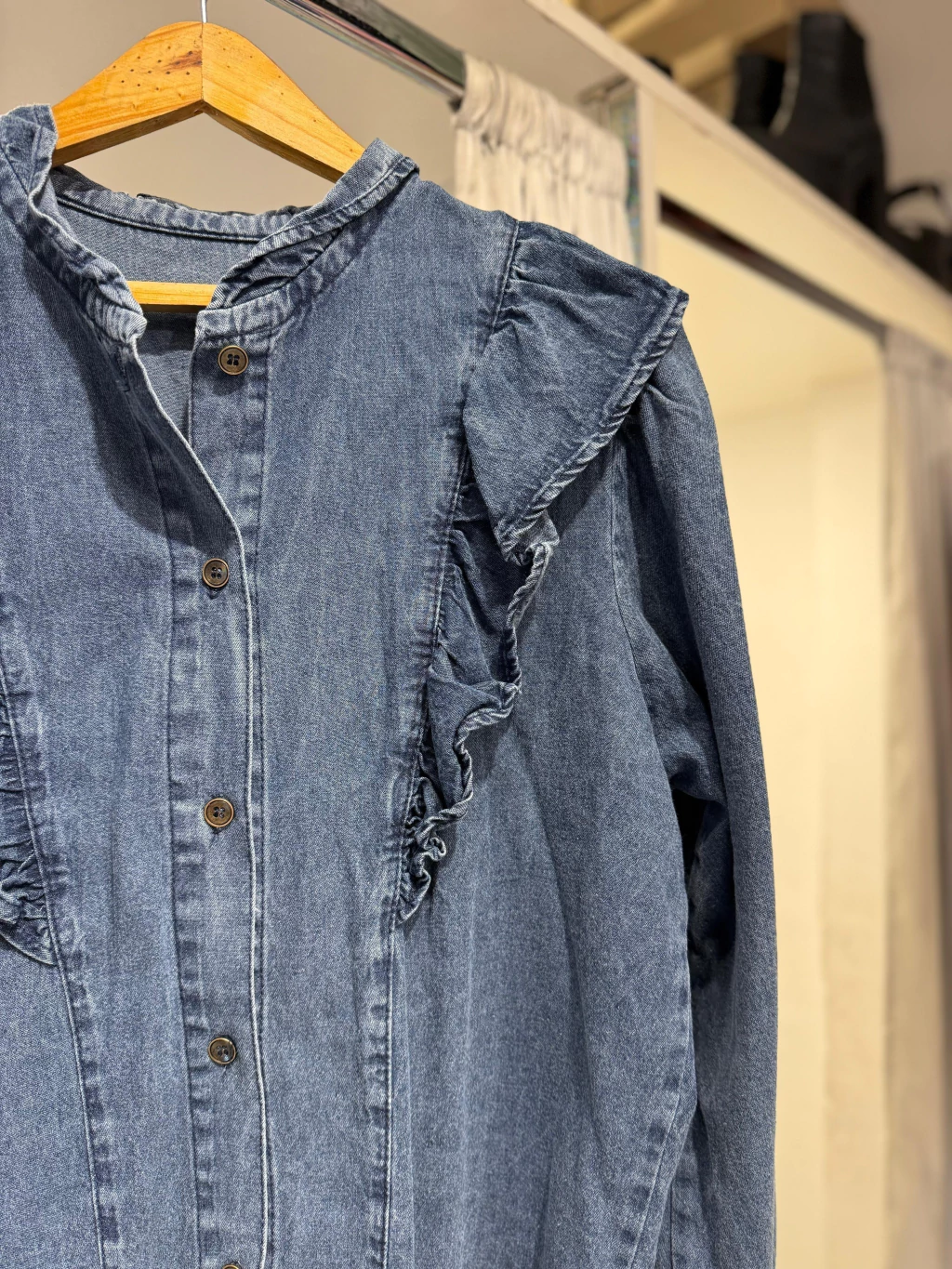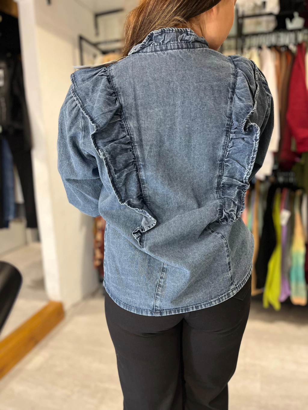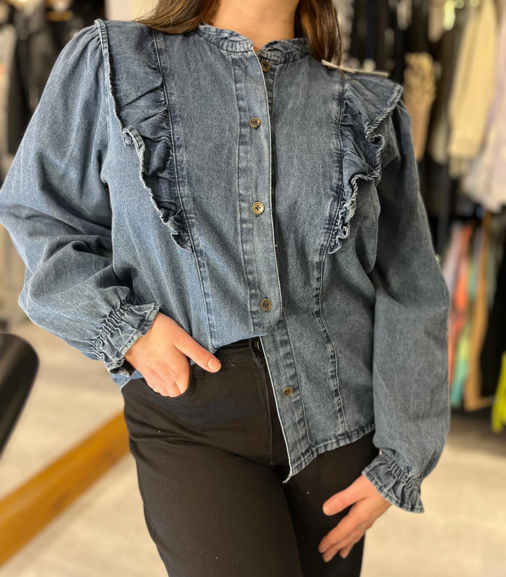 Camisa de Jean con Volados en el Frente – Un básico con un toque femenino y moderno. Confeccionada en jean de calidad, presenta volados en el frente que aportan delicadeza y movimiento al look. Ideal para combinar con jeans, pantalones o faldas, logrando un outfit casual, fresco y con estilo.