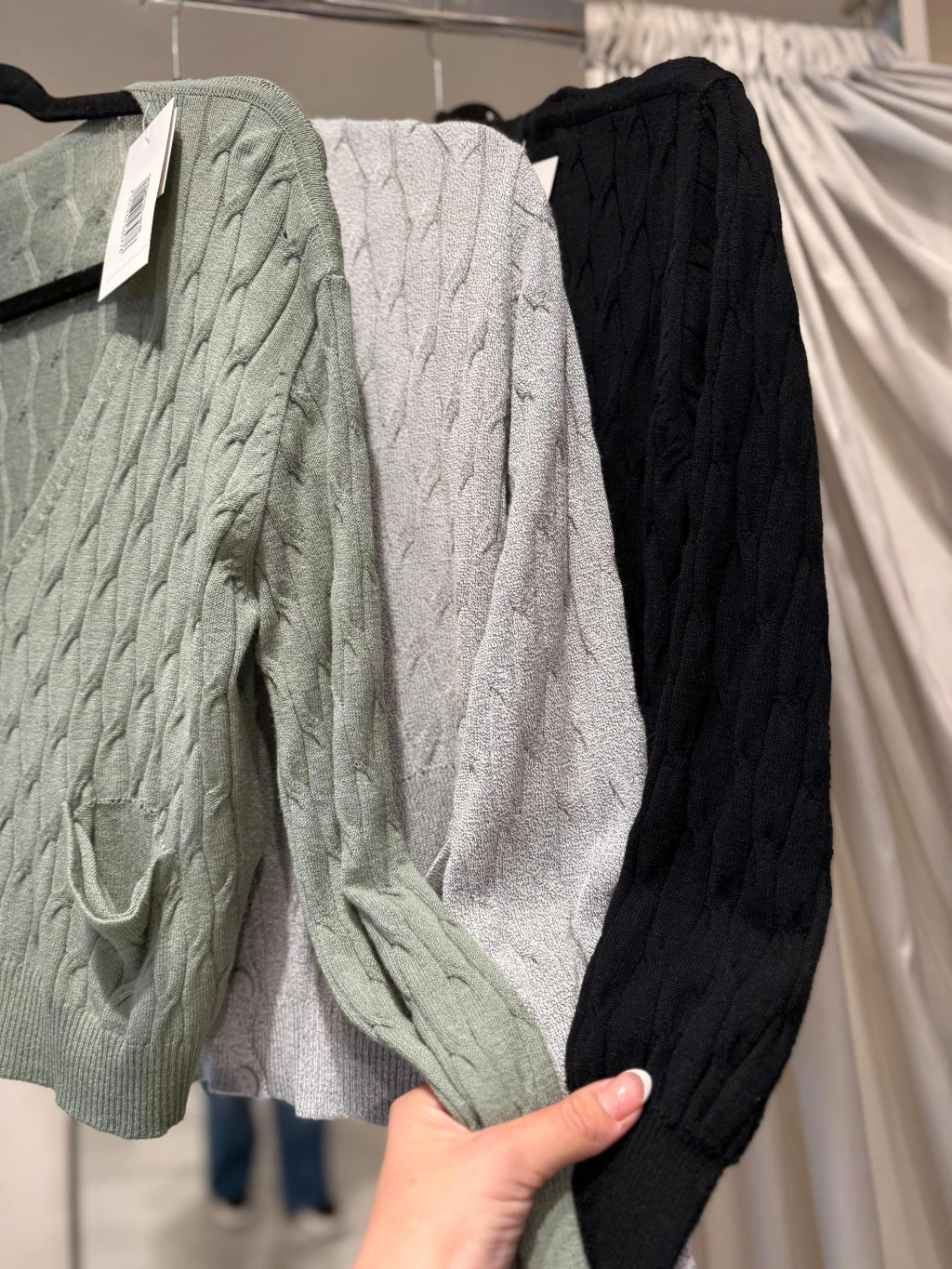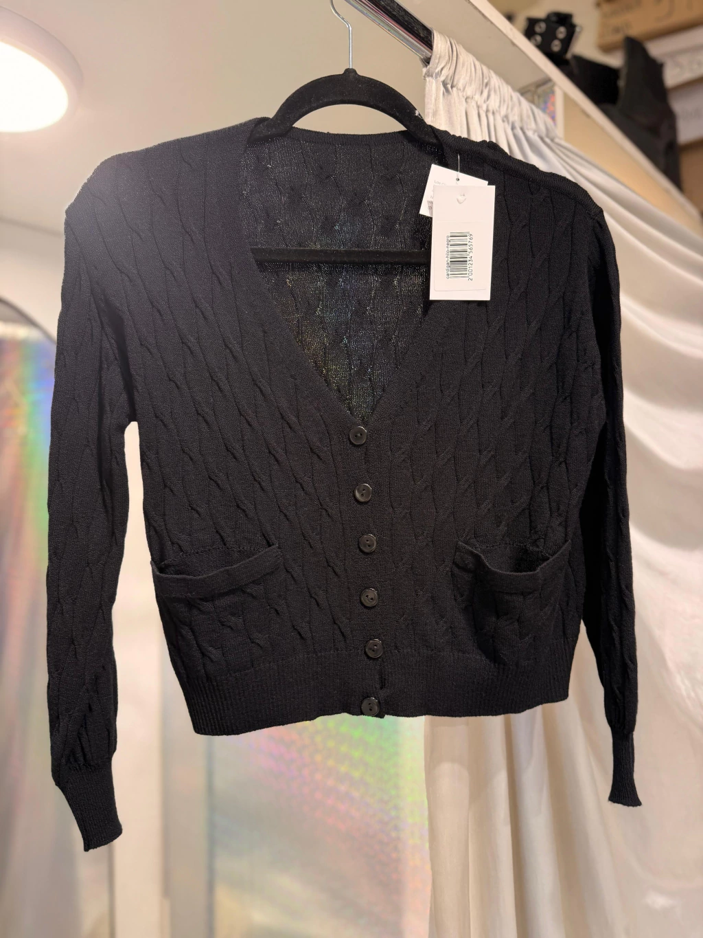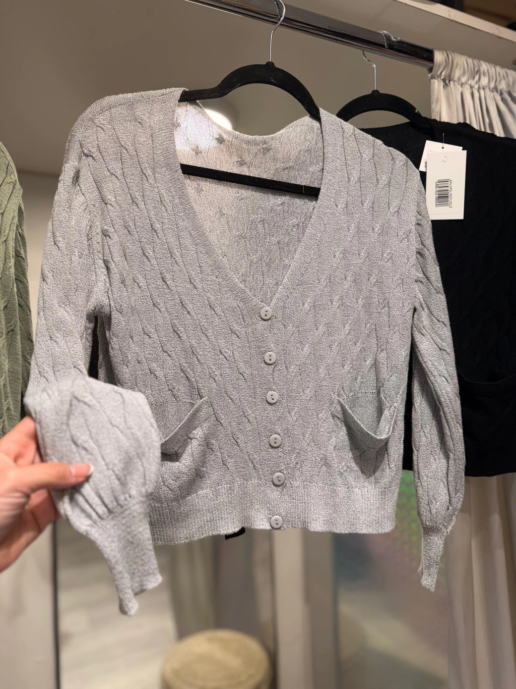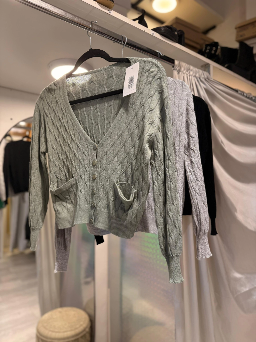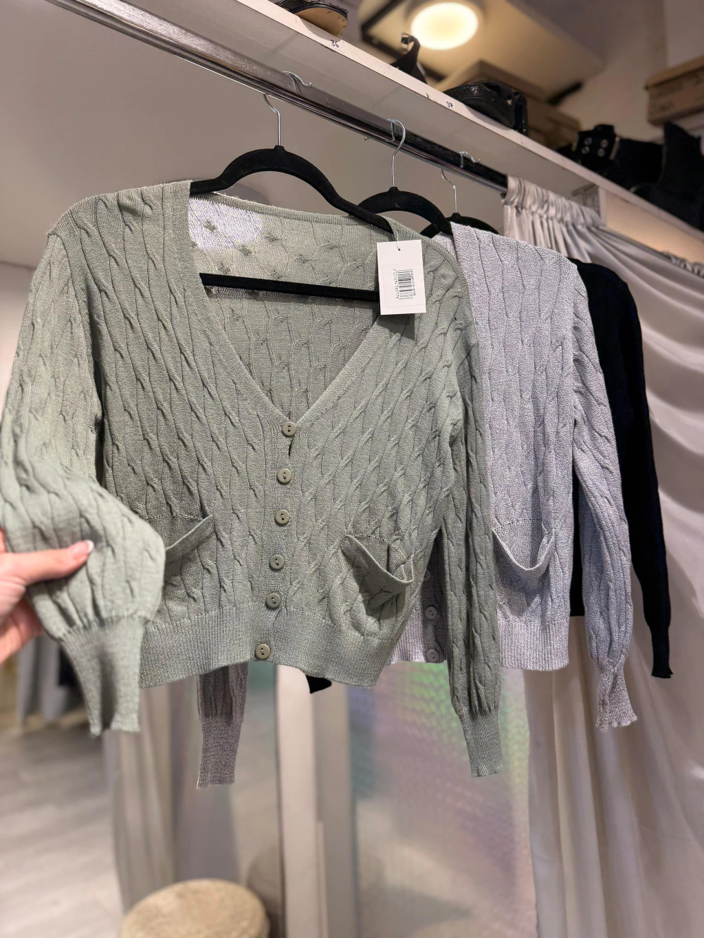 Cardigan tejido en hilo, de largo corto y escote en V, con un delicado diseño en ochos que aporta textura y estilo. Cuenta con bolsillos frontales, combinando practicidad y detalle artesanal. Ideal para superponer con remeras, blusas o vestidos, perfecto para un look cómodo y canchero.
