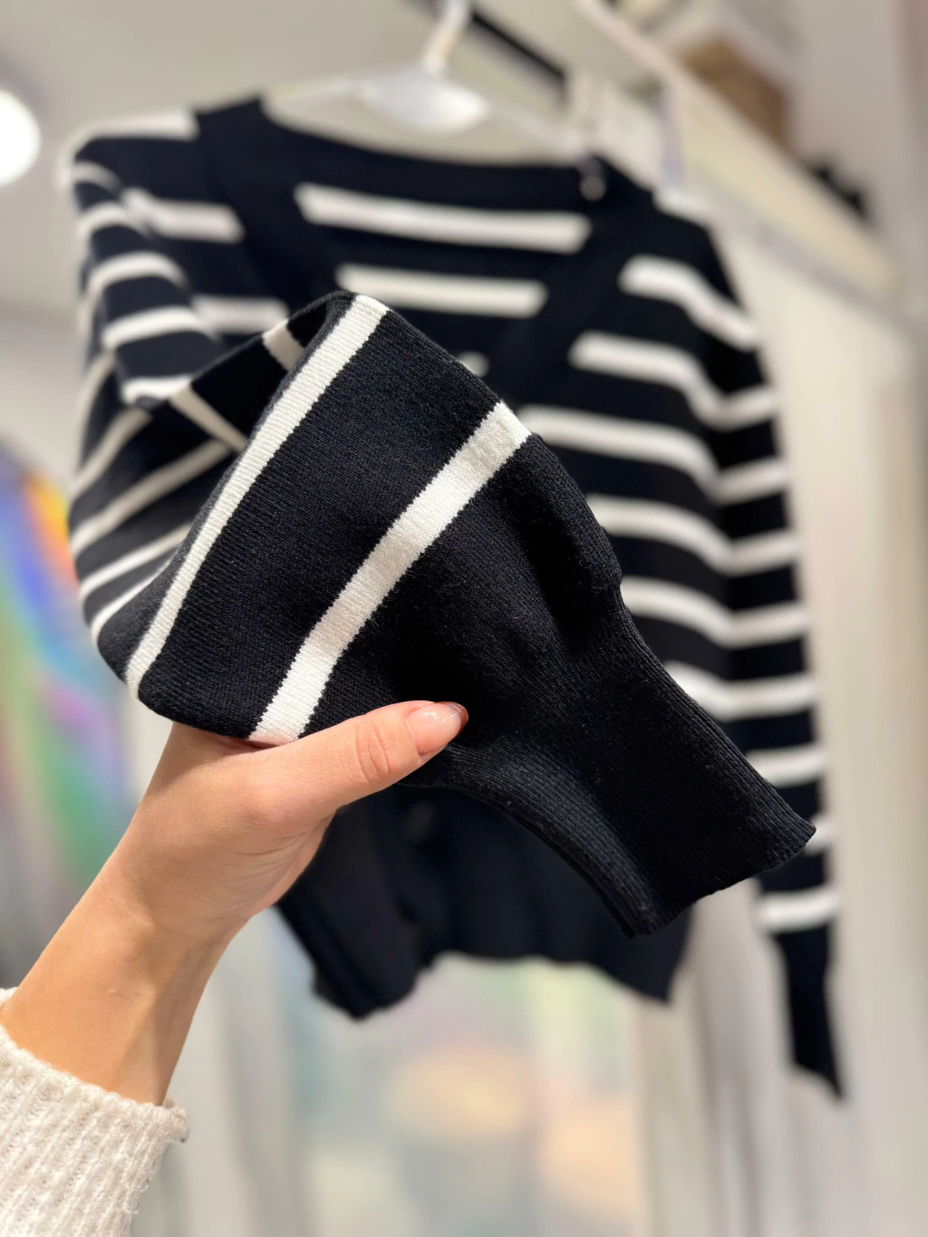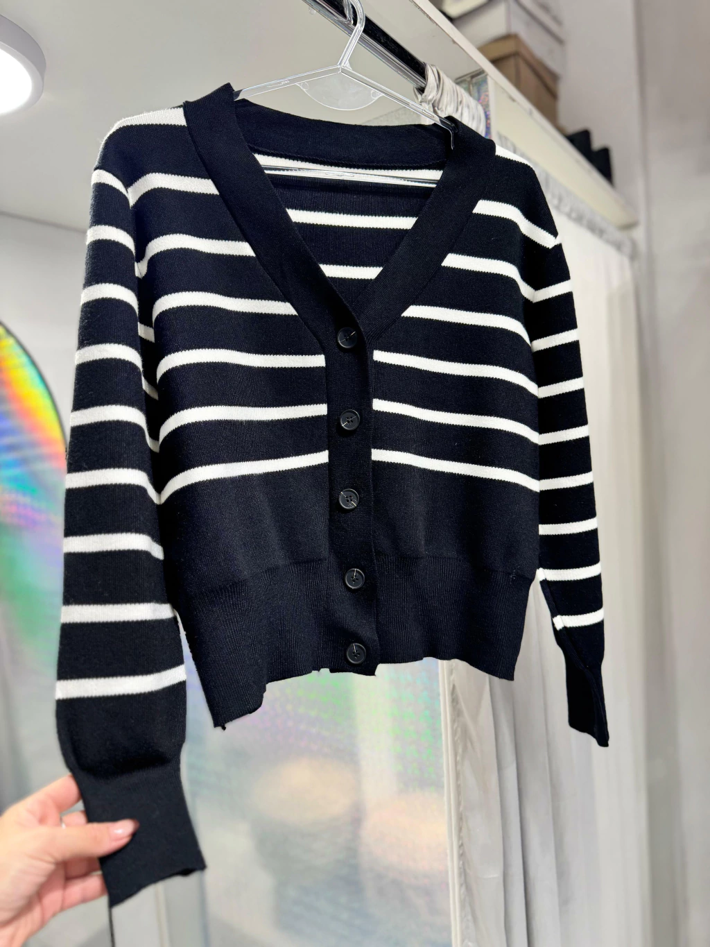 Cardigan Rayado Premium: elegancia y confort en cada detalle. Este cardigan negro con rayas blancas presenta un escote en V hasta la cintura que estiliza la figura. Su corte entallado y confección en doble bremer de calidad premium garantizan una textura suave y duradera. Ideal para combinar con cualquier outfit, aporta un toque sofisticado y moderno a tu guardarropa. ¡Siente la diferencia de un diseño pensado para ti!