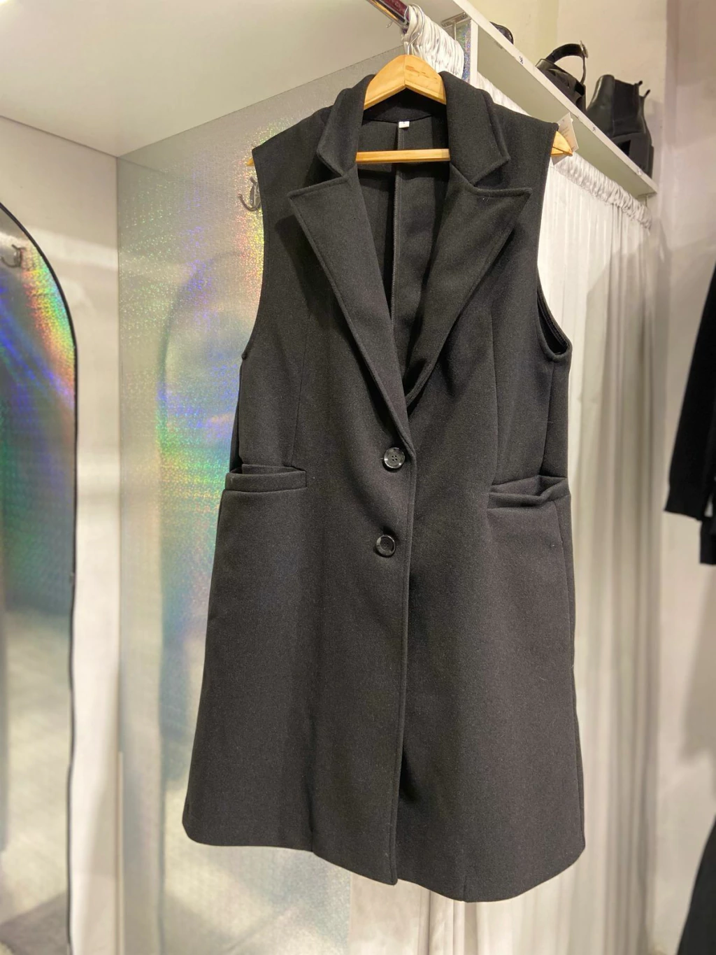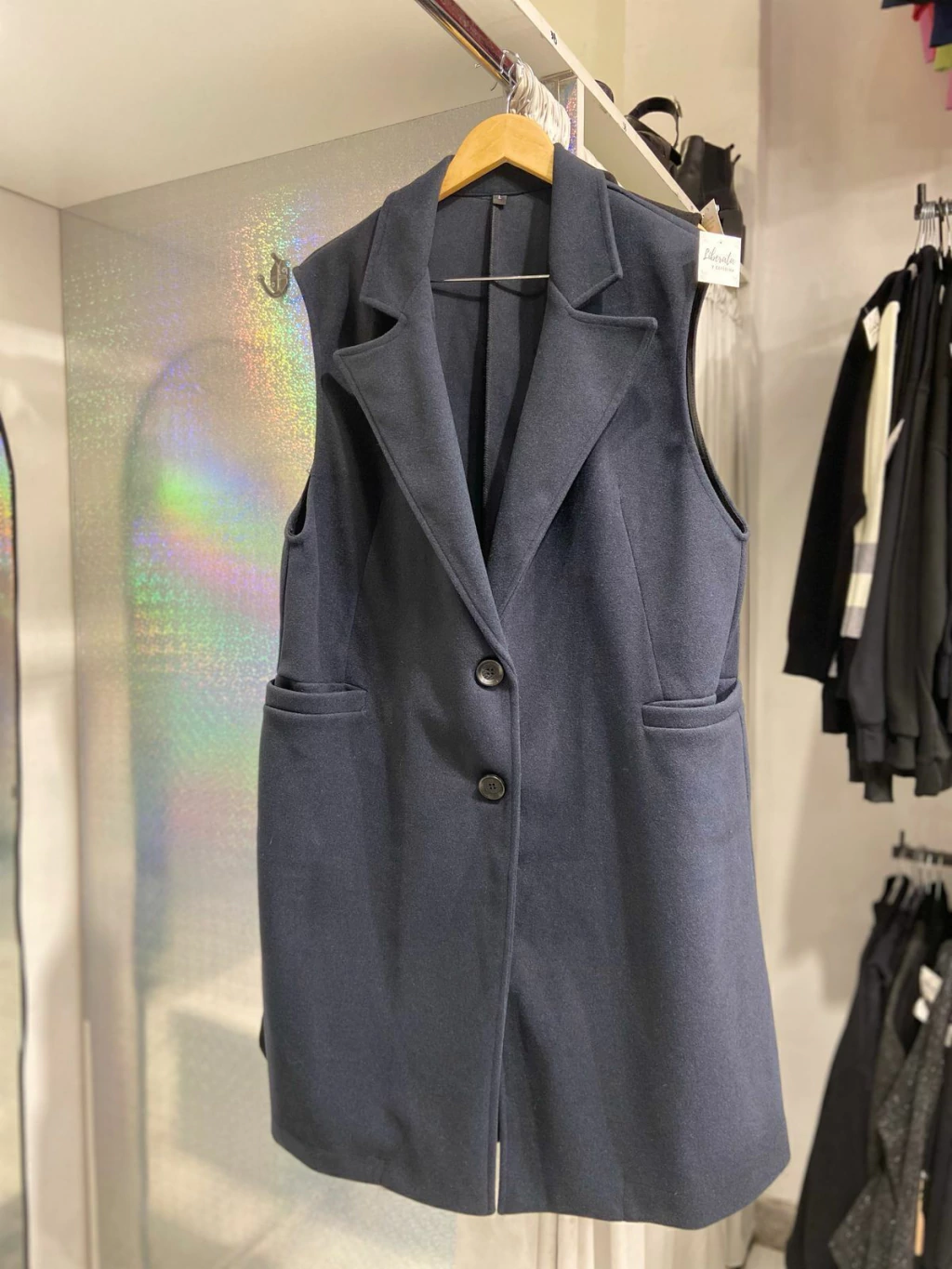 Este chaleco largo de paño es una prenda elegante y versátil que combina comodidad y estilo. Confeccionado en un suave paño de alta calidad, tiene un corte alargado que le da un toque sofisticado. Su diseño incluye dos botones en la parte frontal, lo que aporta un aire clásico y refinado. Ideal para llevar sobre camisas o suéteres, este chaleco es perfecto para ocasiones formales o para dar un toque chic a tu look diario. Su textura de paño lo convierte en una excelente opción para el entretiempo, brindando calidez y distinción a tu atuendo.