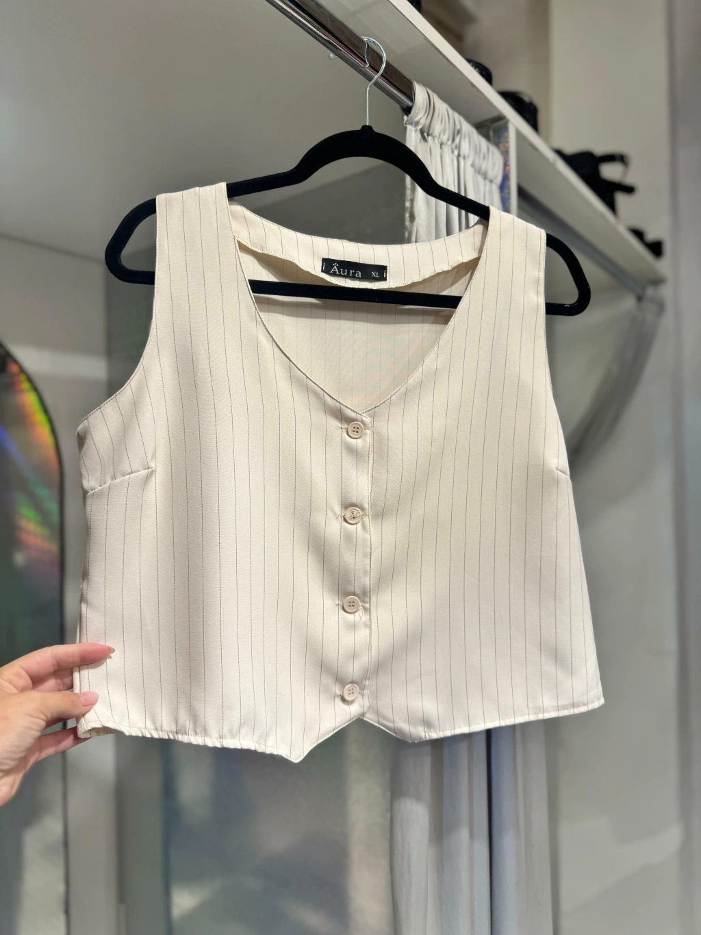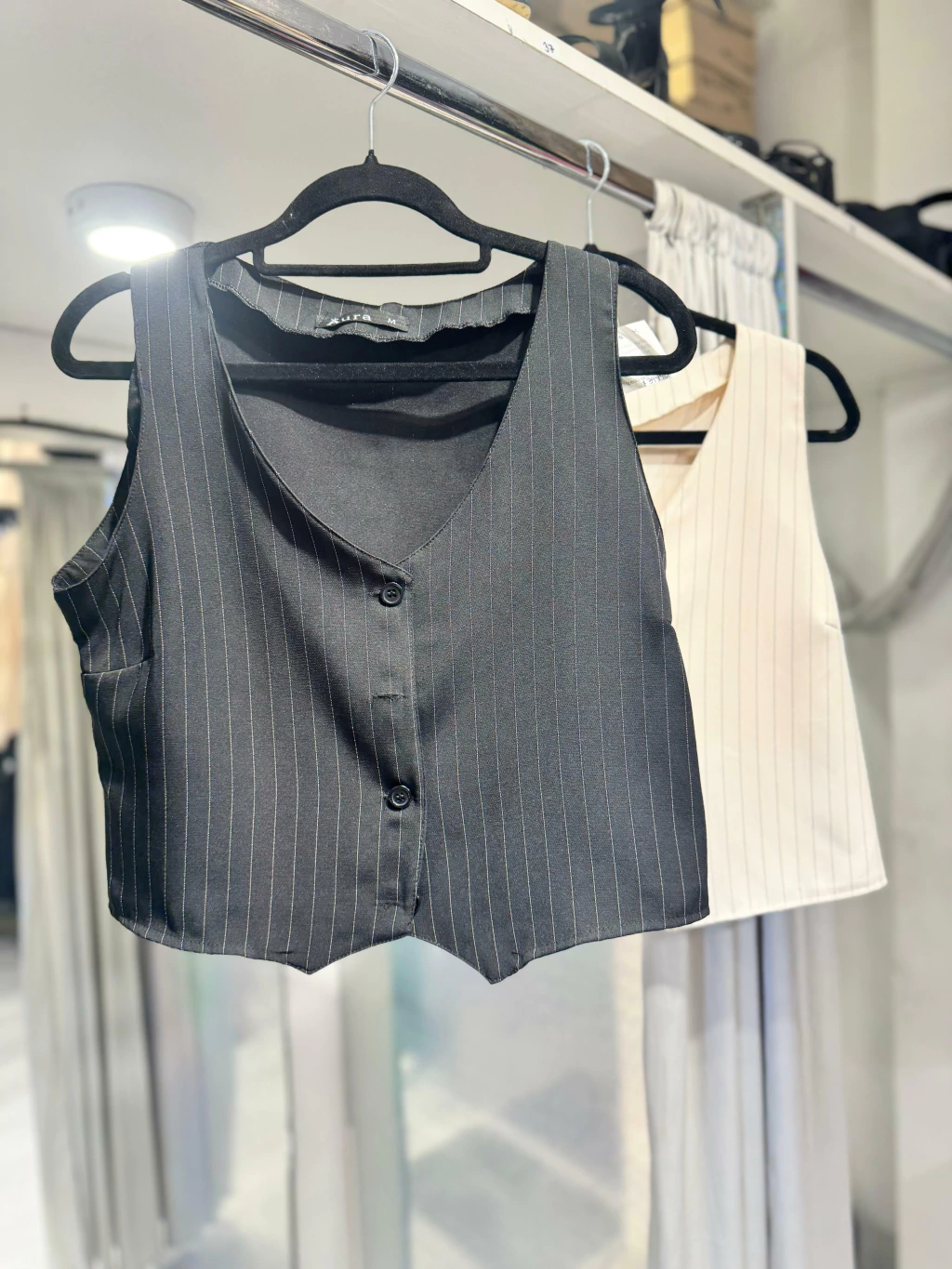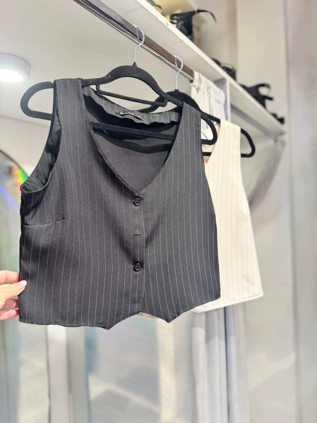 Este chaleco sastrero rayado es una prenda de corte clásico y elegante que aporta sofisticación a cualquier atuendo. Con un patrón de rayas sutiles que añaden dinamismo y estilo, es ideal para combinar con pantalones de vestir o faldas para un look profesional o de noche. Su diseño estructurado con cortes precisos resalta la figura, mientras que el tejido de alta calidad garantiza comodidad y durabilidad.