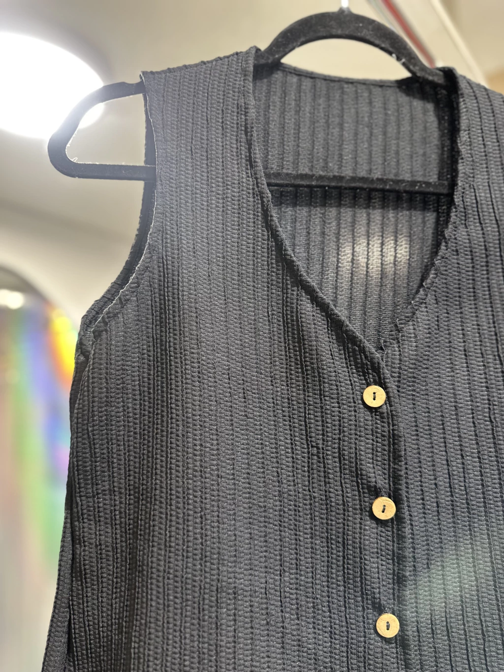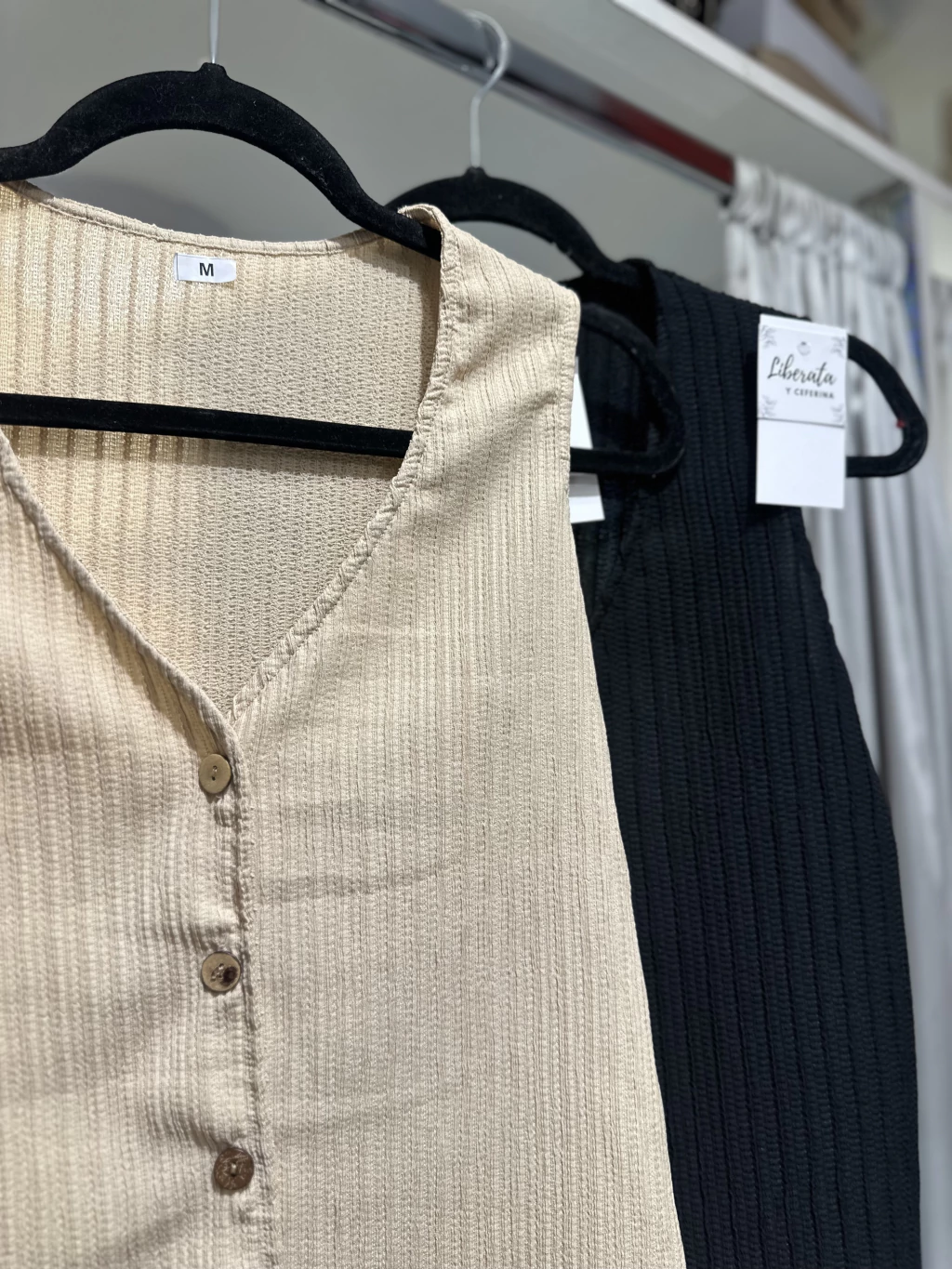Chaleco de bambula texturada – Confeccionado en bambula liviana y fresca, de textura natural que aporta un estilo relajado. De corte clásico y botones de madera, es un complemento versátil para sumar a cualquier look de temporada.