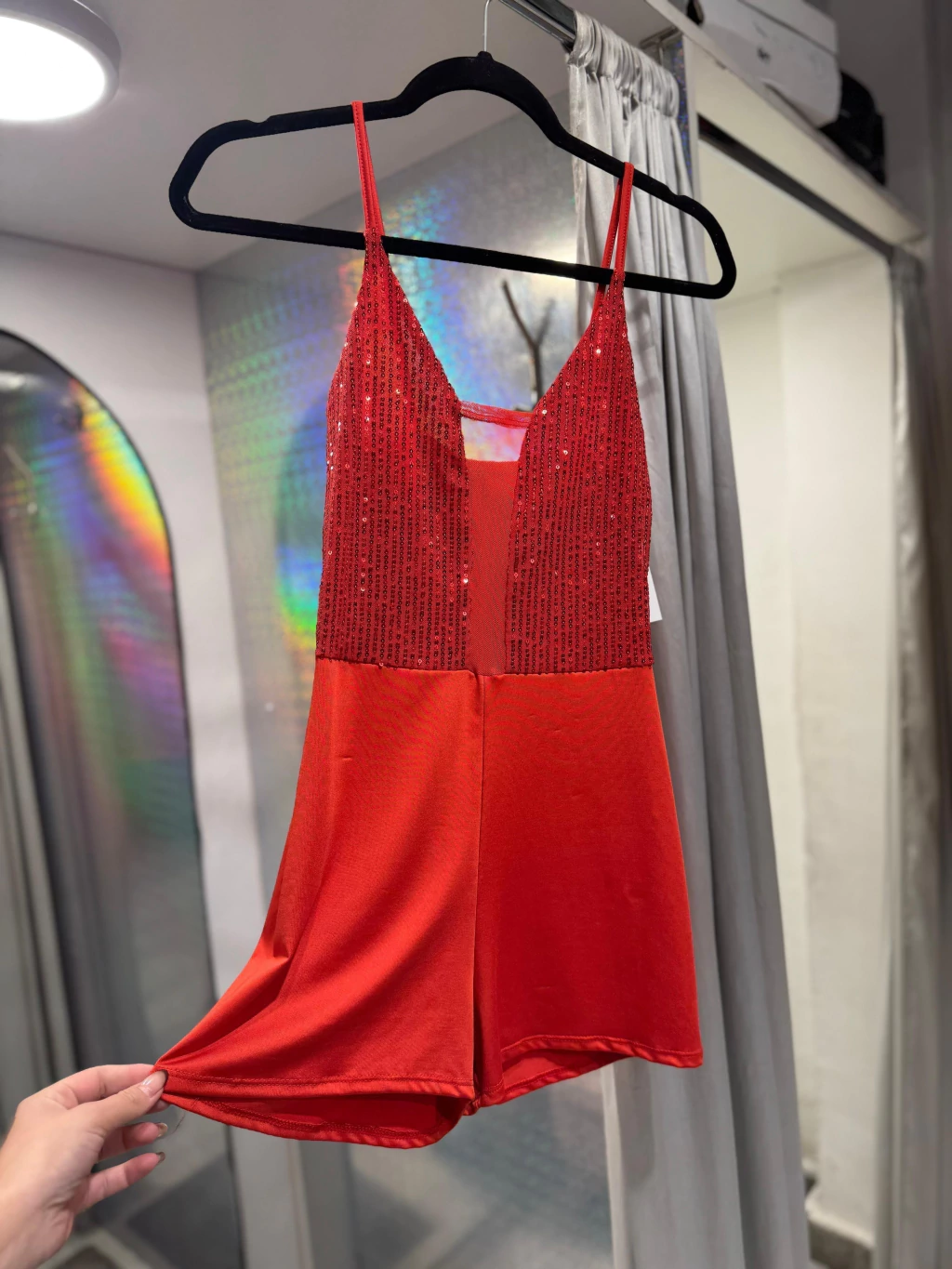 Mono rojo lentejuela, ideal para una fiesta o evento, cómodo y sutil.