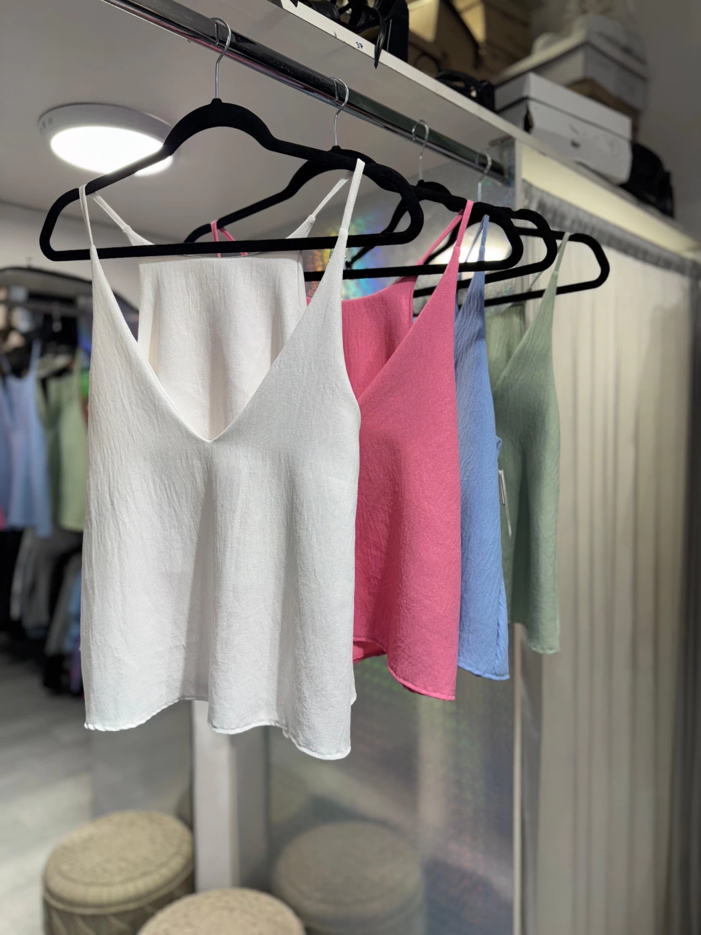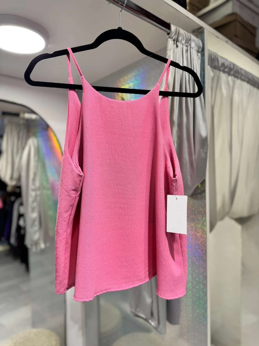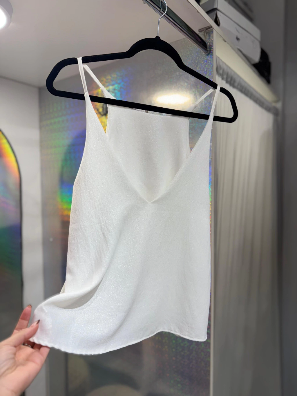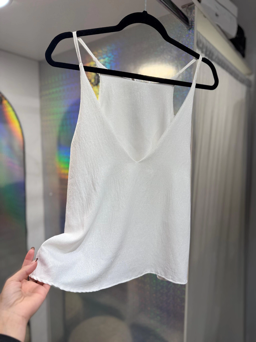 Musculosa Crepe Brillosa Reversible Descubre la versatilidad de nuestra musculosa reversible, diseñada para adaptarse a tu estilo diario. Con un encantador escote redondo de un lado y escote en V del otro, esta prenda te ofrece dos looks en uno. Confeccionada en un material de crep brilloso, su corte evase garantiza comodidad y elegancia en cualquier ocasión.