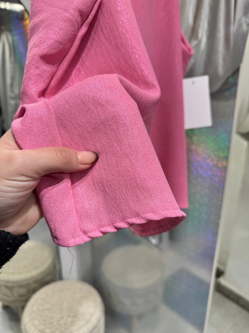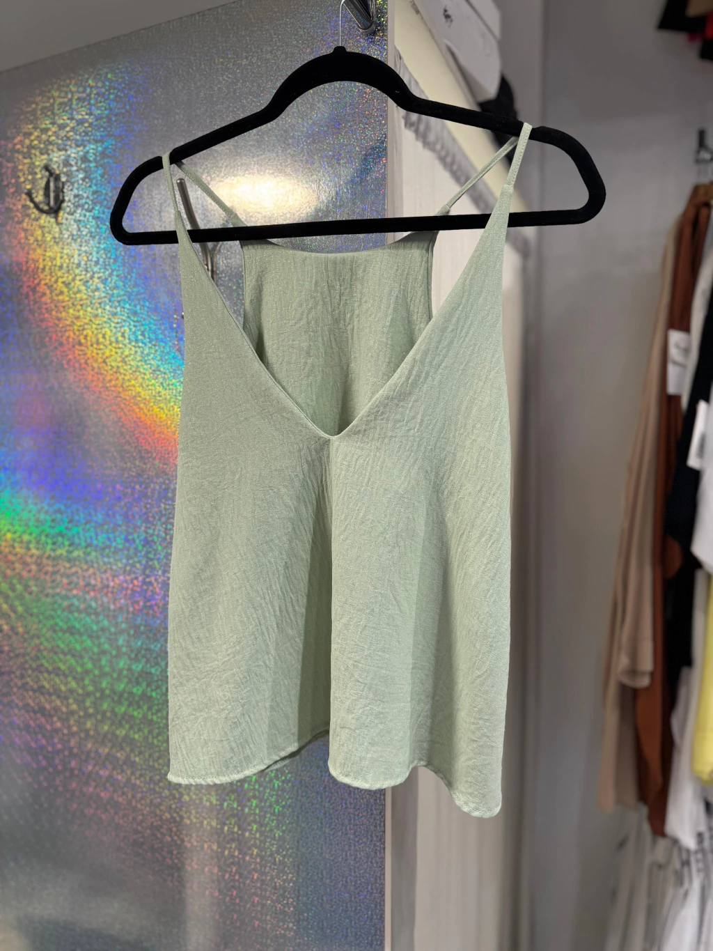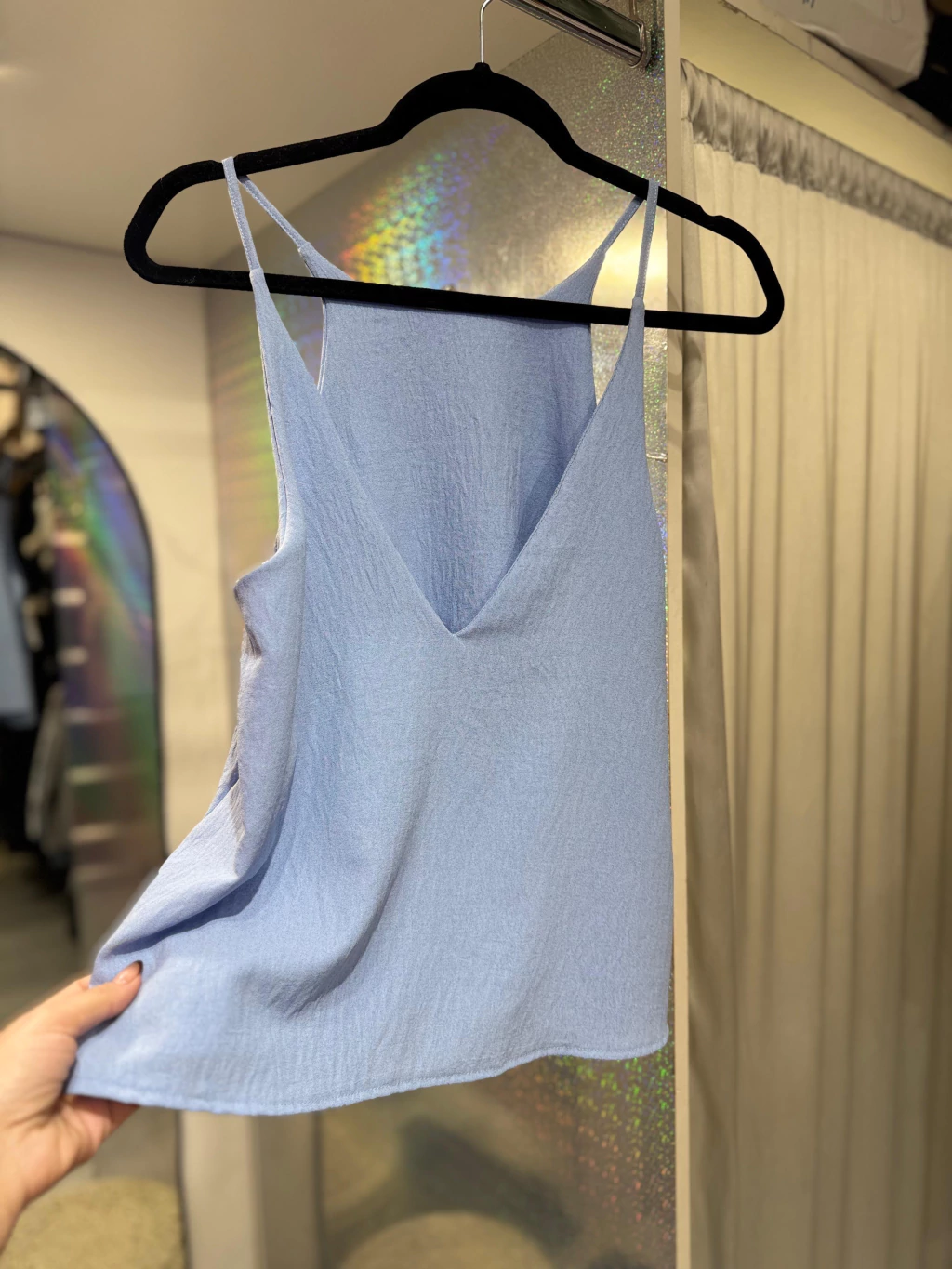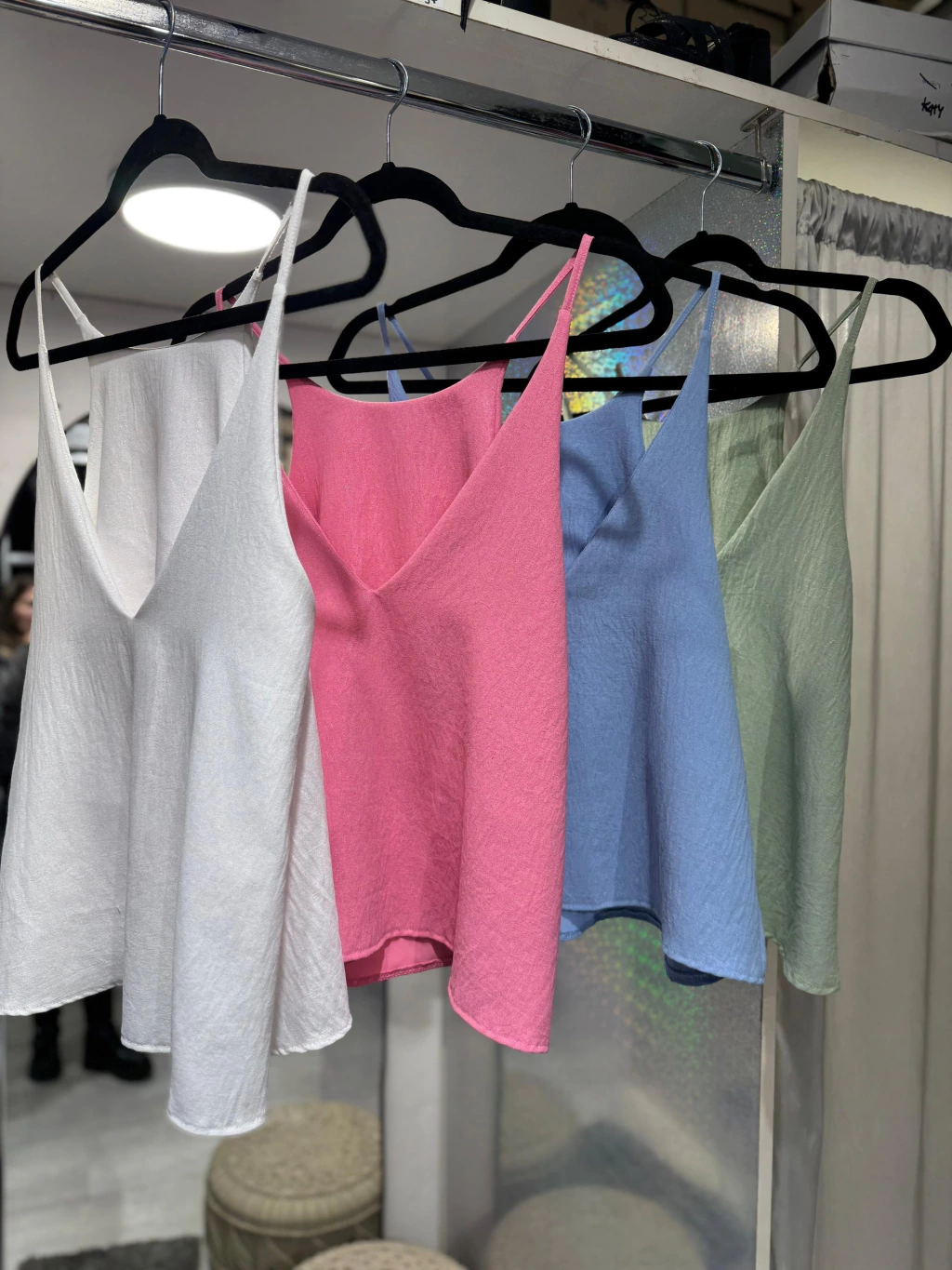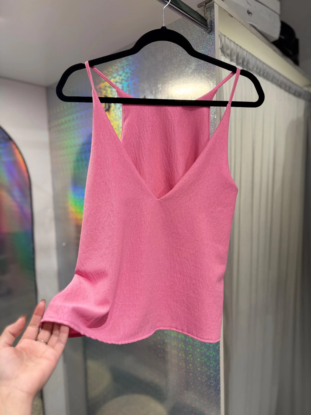 Musculosa Crepe Brillosa Reversible Descubre la versatilidad de nuestra musculosa reversible, diseñada para adaptarse a tu estilo diario. Con un encantador escote redondo de un lado y escote en V del otro, esta prenda te ofrece dos looks en uno. Confeccionada en un material de crep brilloso, su corte evase garantiza comodidad y elegancia en cualquier ocasión.