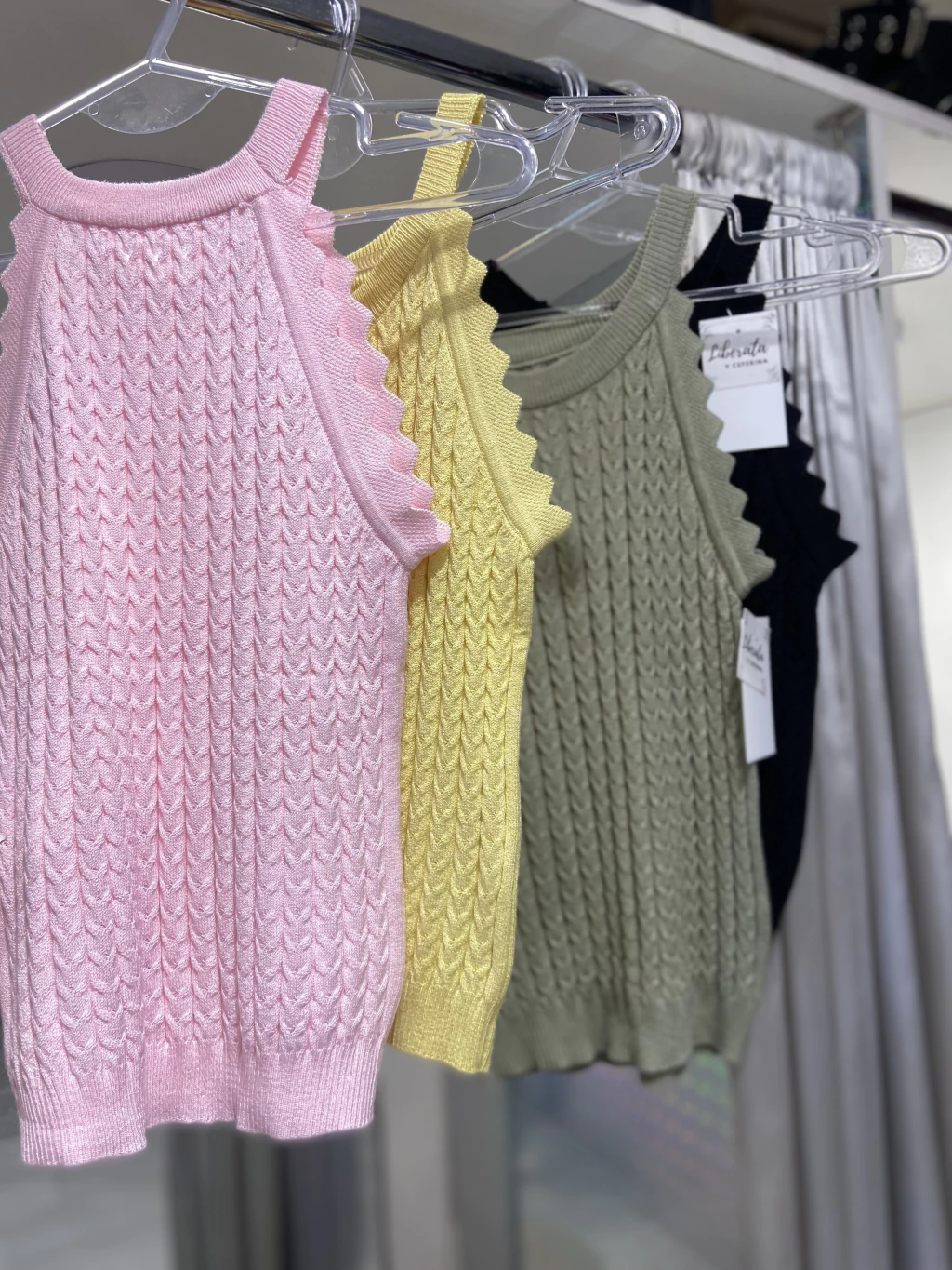 Musculosa tejida en hilo, con diseño clásico de cuello americano y delicados detalles de ochos que le dan textura y estilo. De calce entallado, es perfecta para combinar con palazos, shorts o faldas, sumando un toque elegante y moderno a tus looks diarios.