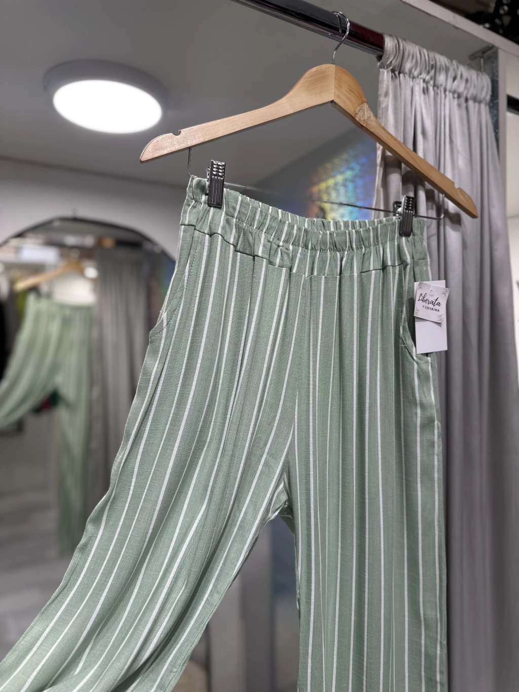 Un clásico renovado para esta temporada. El Palazo Malva está confeccionado en lino fresco con rayas en verde y blanco, ideal para lograr un look relajado pero con mucho estilo.