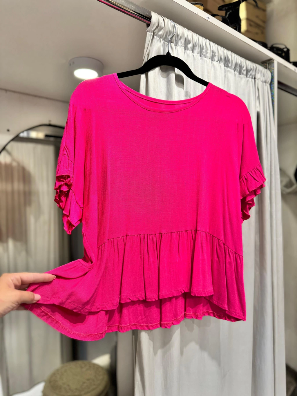 Confeccionada en lino liviano y natural, esta remera en vibrante tono fucsia aporta energía y estilo a cualquier look. Su diseño se realza con volados delicados, que suman un toque femenino y movimiento. De calce cómodo y aireado, es ideal para los días cálidos, combinando perfectamente con prendas neutras o estampadas. Una prenda que no pasa desapercibida.