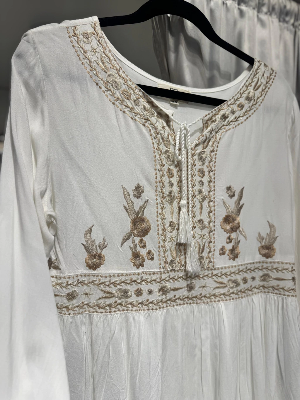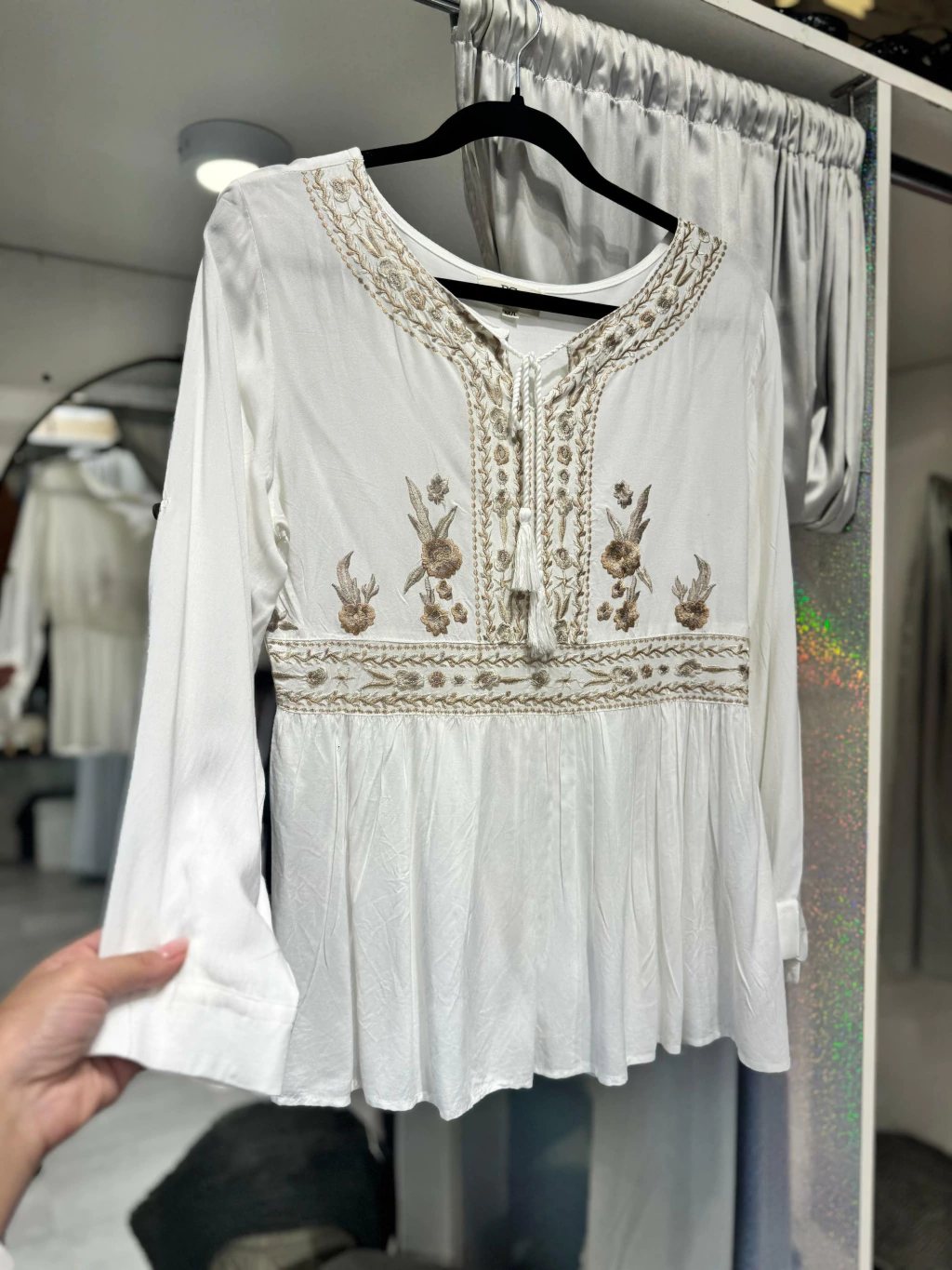 La remera hindu refleja un estilo relajado y con personalidad. Confeccionada en fibrana liviana con bordados dorados, ofrece un brillo sutil que realza su impronta artesanal. El detalle de plumeros aporta un toque étnico y distintivo, completando una prenda de espíritu libre y bohemio. Ideal para looks de verano con shorts, jeans o faldas, y perfecta para llevar en viajes o festivales.