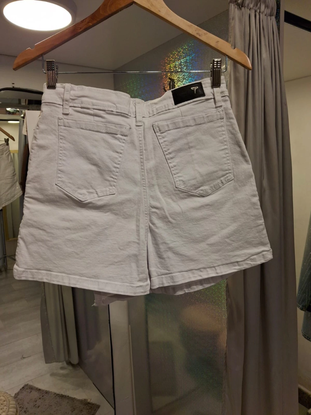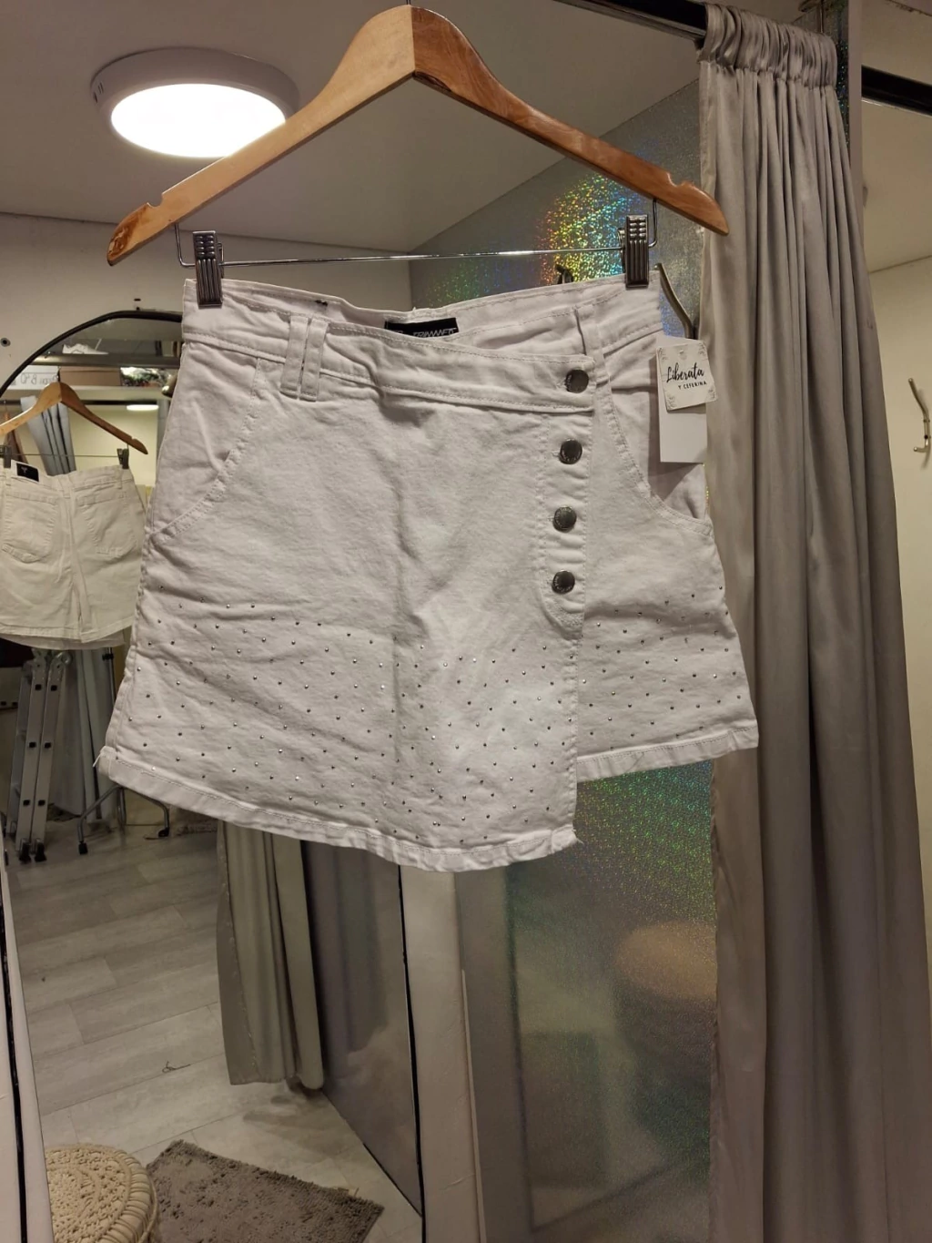 Short pollera de jean blanco con 4 botones delanteros y detalle de strass en el borde inferior. Una prenda femenina y moderna que combina el toque clásico del blanco con el brillo delicado del strass, perfecta para elevar tus looks casuales con estilo.