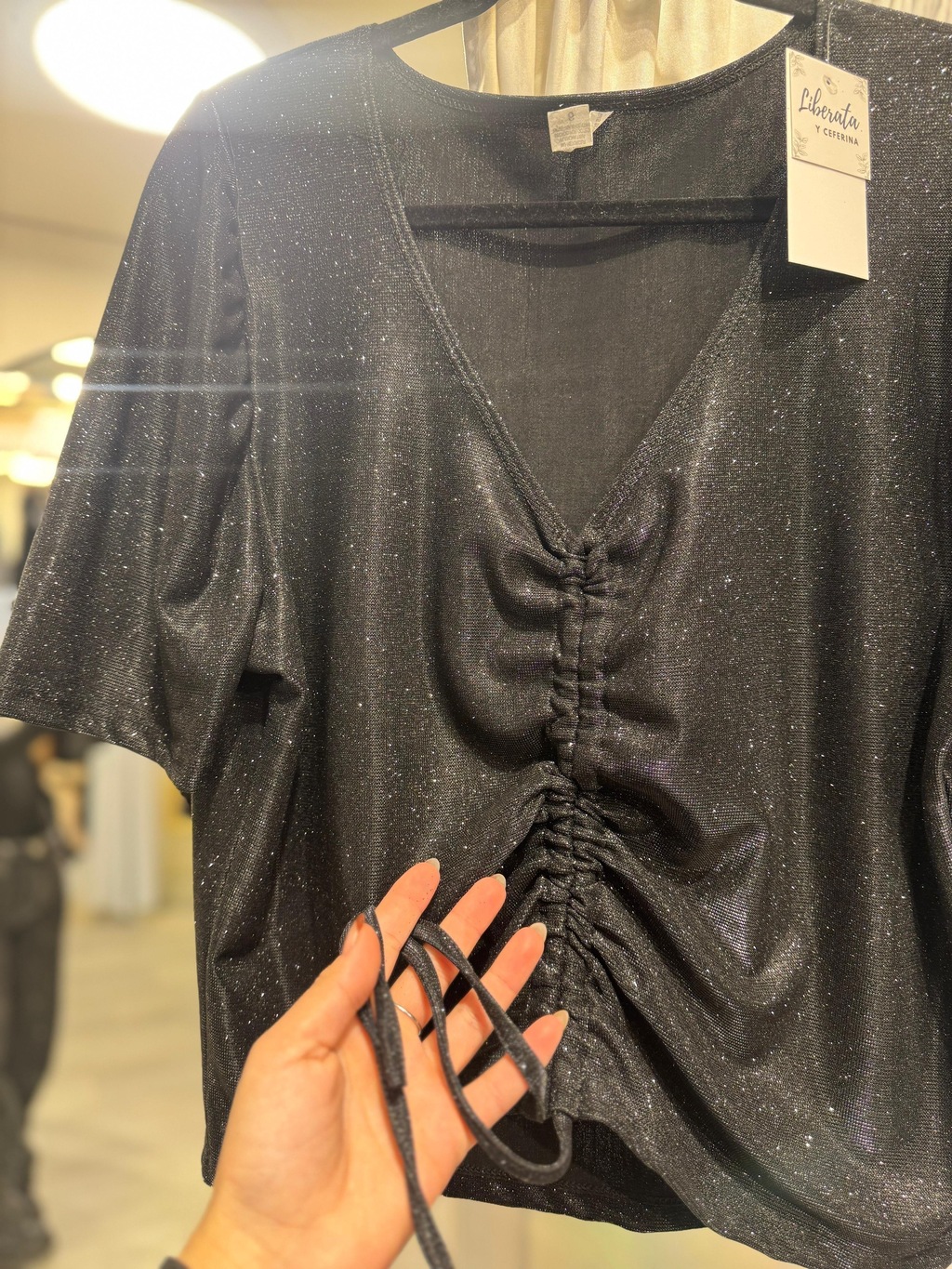 Descubrí la Blusa Top Glitter Frunce, una prenda que combina el glamour y la frescura para que brilles en cualquier ocasión. Su diseño corto tipo top con frunce en el centro realza tu figura y aporta un toque sofisticado y a la vez moderno a tu look.