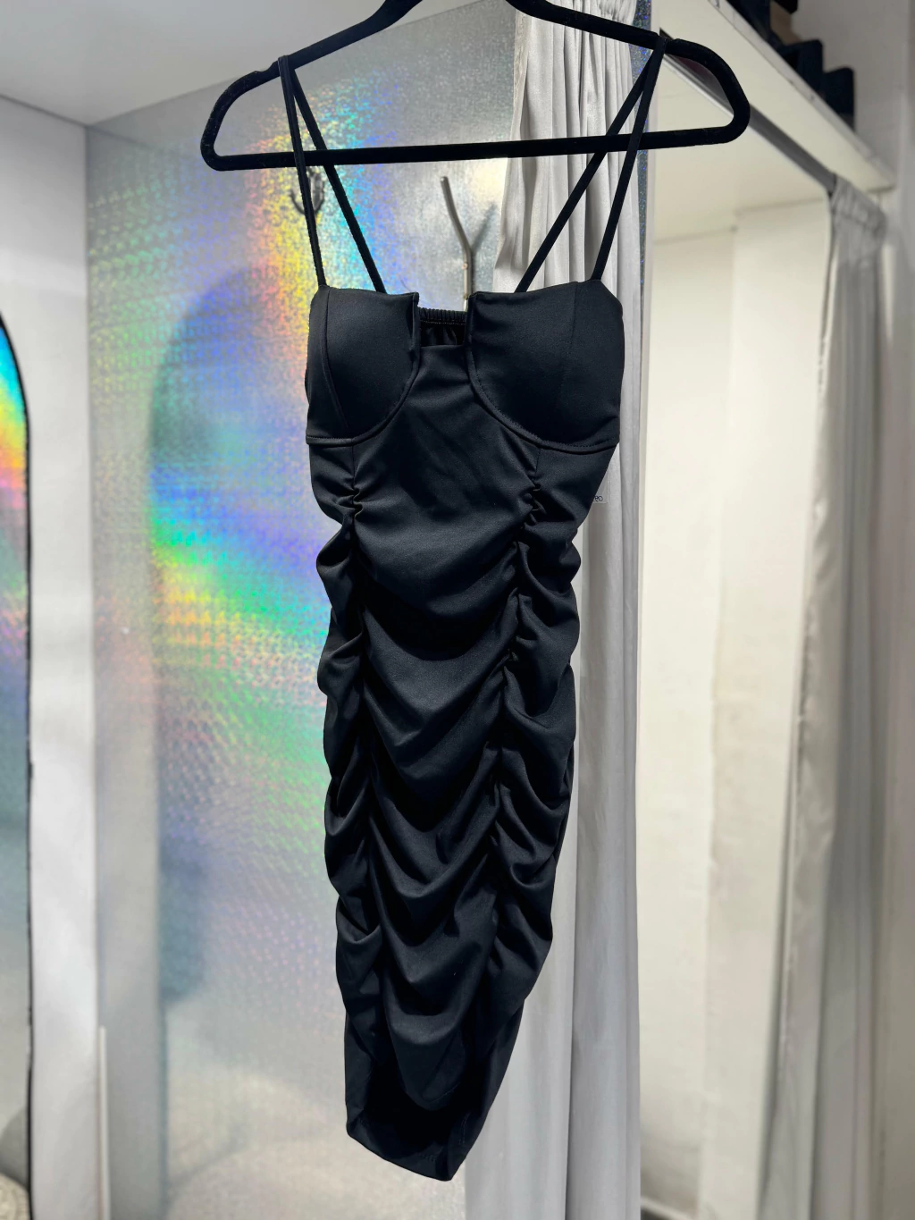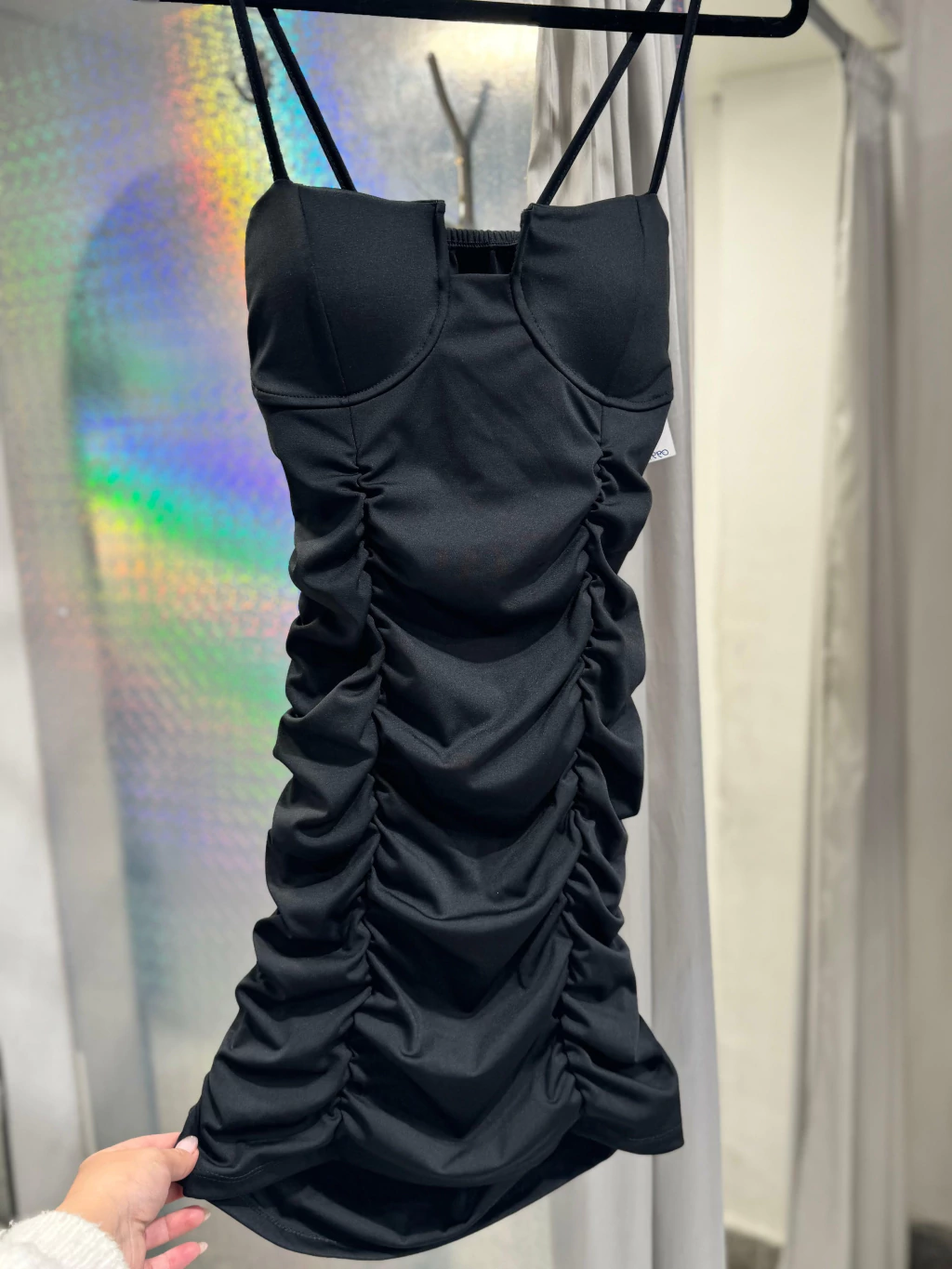 Vestido Corto Fruncido Escote V Descubrí la combinación perfecta entre estilo y comodidad con este vestido corto de lycra. Su diseño con frunces realza la figura, mientras que la taza armada brinda soporte y forma al busto. El escote en V aporta un toque elegante y sensual, ideal para tus salidas especiales. Disponible en talles que se adaptan a vos para que te sientas segura y radiante en cada momento.