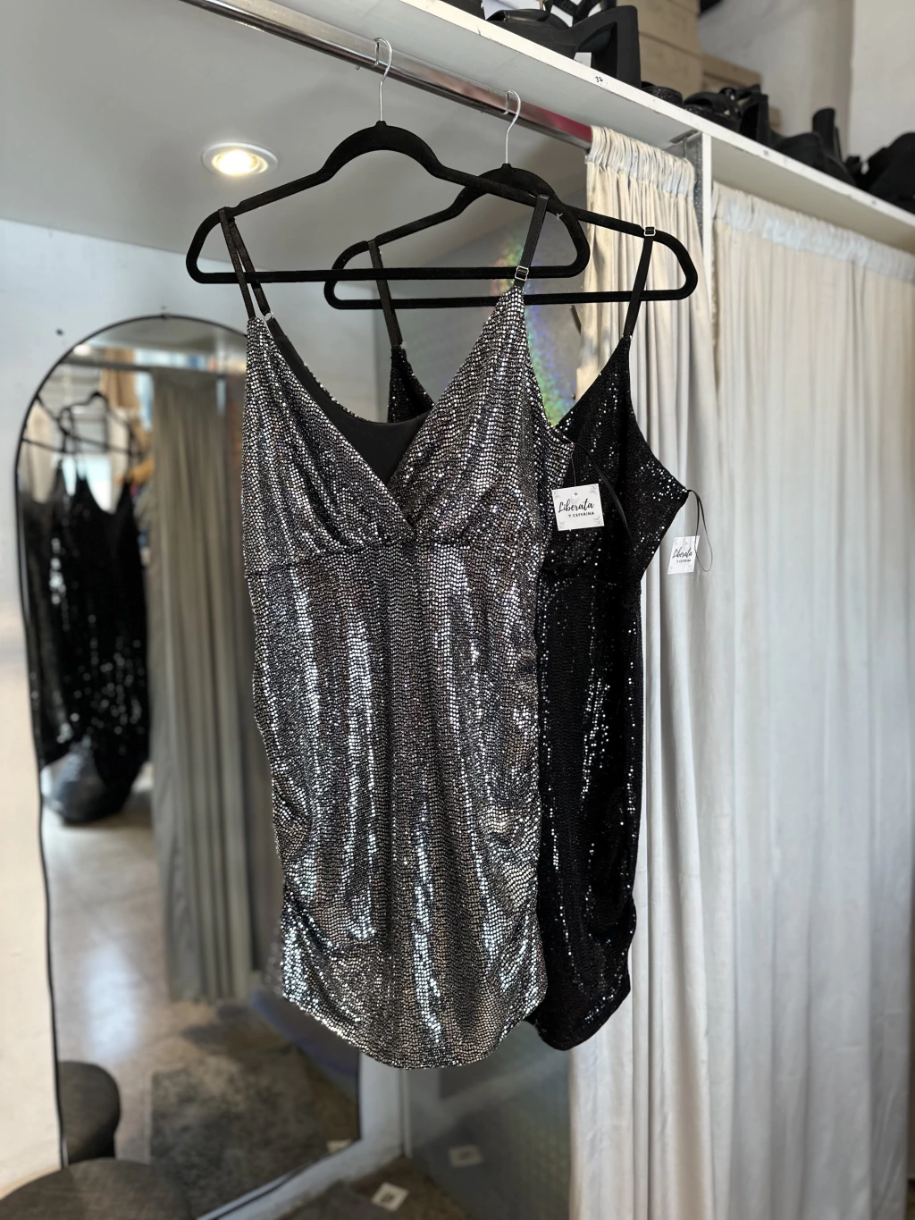 Un vestido corto de lentejuelas con escote cruzado que resalta la elegancia y el glamour. El escote cruzado da un toque sofisticado y moderno, mientras que las tiras de bretel regulables permiten un ajuste personalizado para mayor comodidad. La falda, con un delicado drapeado, cae suavemente y crea un movimiento fluido que acentúa la figura. Las lentejuelas cubren todo el vestido, reflejando la luz y añadiendo un brillo deslumbrante que lo convierte en una opción perfecta para una fiesta o evento nocturno. Es un diseño que combina sensualidad y estilo con un toque de sofisticación.