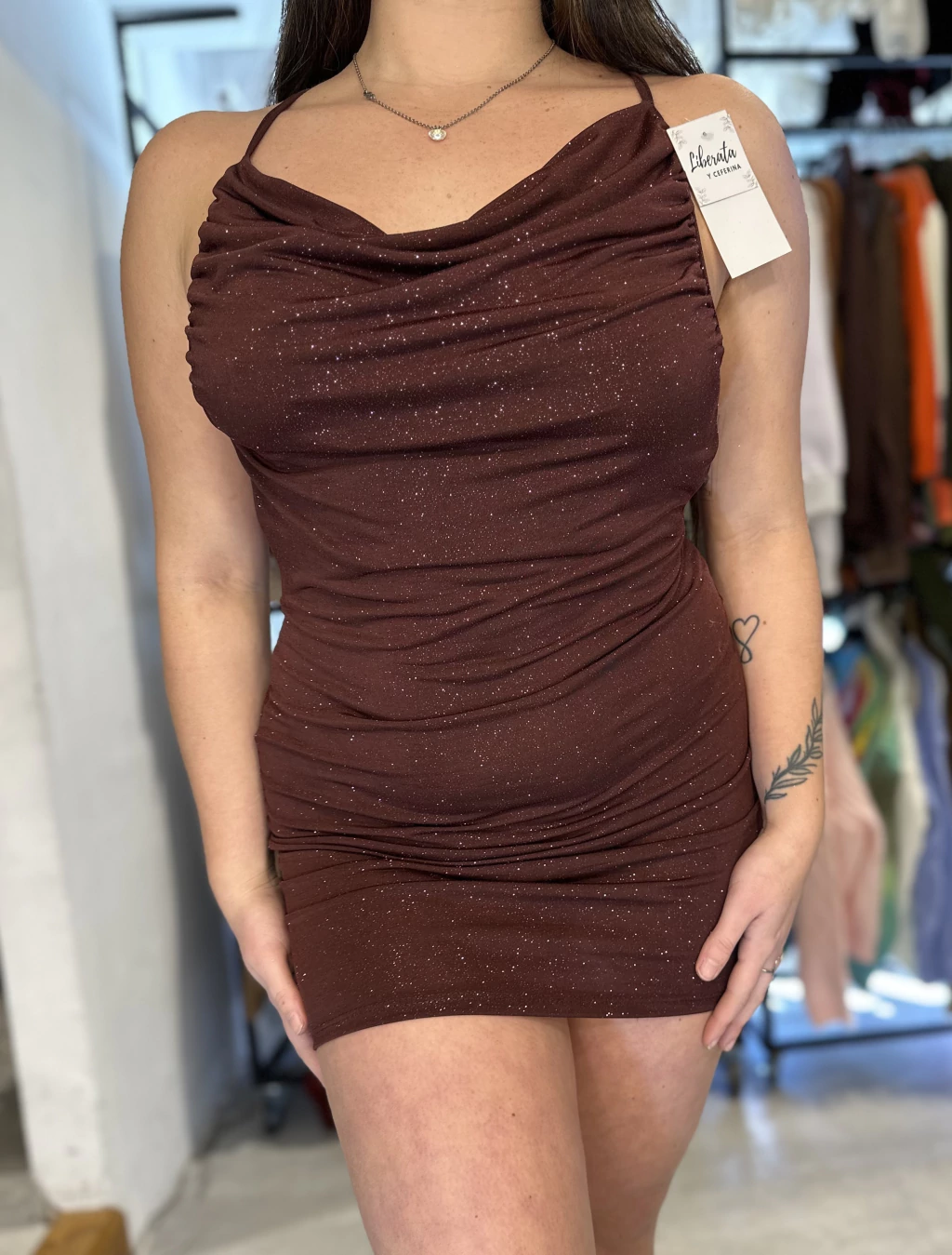 Vestido corto Shine: confeccionado en tela con brillo sutil, presenta escote buche y frunces estratégicos que realzan la silueta. Corto y elegante, ideal para salidas nocturnas o eventos especiales, combinando estilo y comodidad en un solo look.